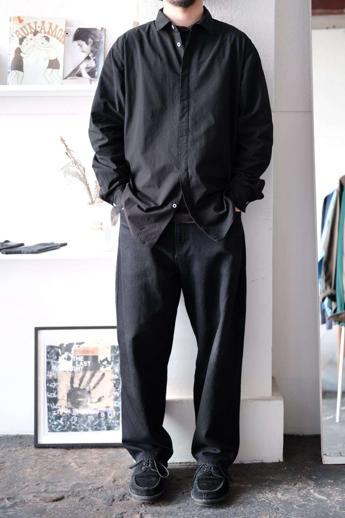MITTANの中で新しいオーソドックスを目指したデザインのシャツです。程よいゆとりを持たせたシルエットで、強撚生地のストレッチ性と相まって快適に着用できます。無駄を削ぎ落とすことを意識し、前立ての比翼仕立てや袖口開きのシンプルな仕様を採用しています。表に見えるステッチは最小限に抑え、製品染めの表情が際立つよう設計しました。機能性に基づいたパターンにより、カジュアルからドレスシーンまで幅広く着用できます。ボタンには貝ボタンを使用しています。