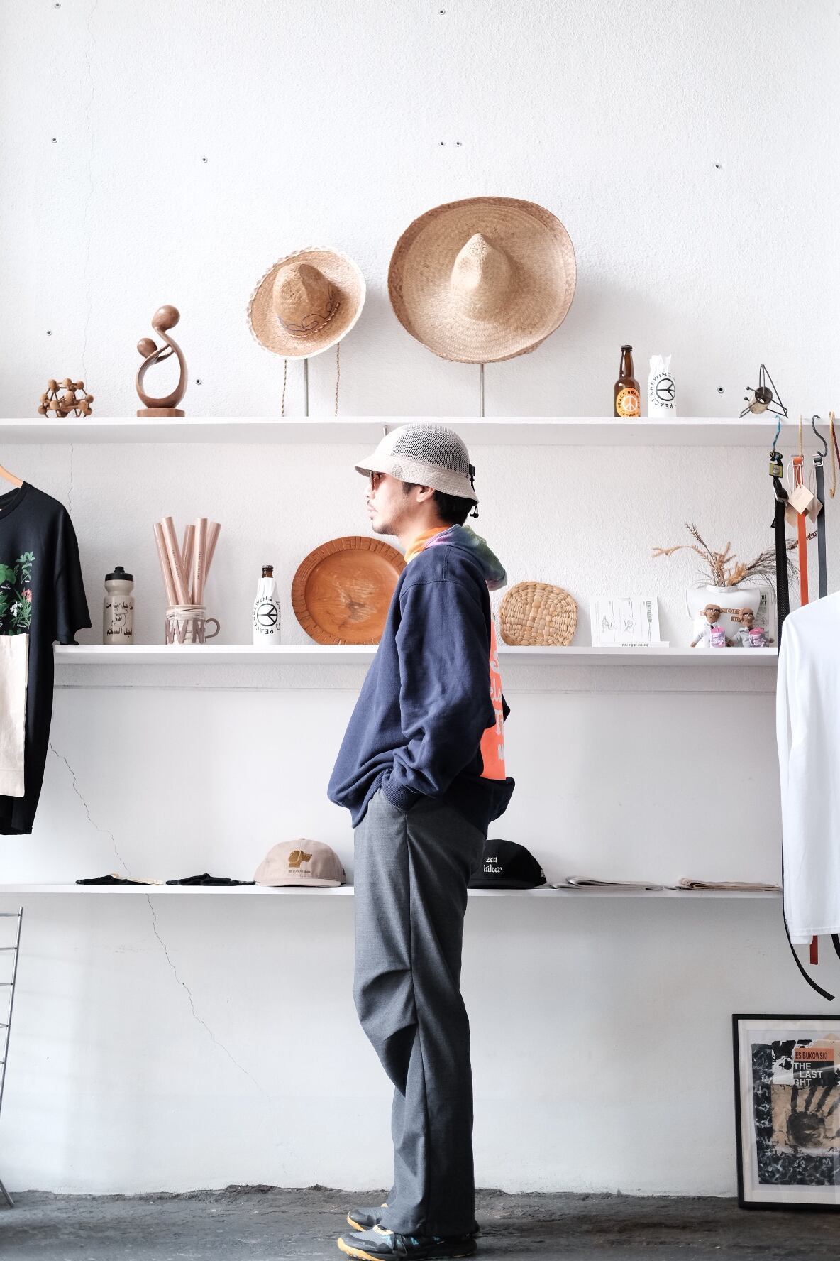 米国ポーラテック社が開発した"POLATEC ALPHA"。通気性とストレッチ性を両立するメッシュ生地をベースに、化繊綿を編みこむことで保温力を持たせたインサレーション素材。毛足のあるフリースのような見た目ですが、濡れても保水せずに速乾性にも優れています。リサイクルポリエステルを使った120g/m2厚のPOLATEC ALPHAをセレクトしました。縫製後に、4回の絞染でタイダイ風に仕上げました。
