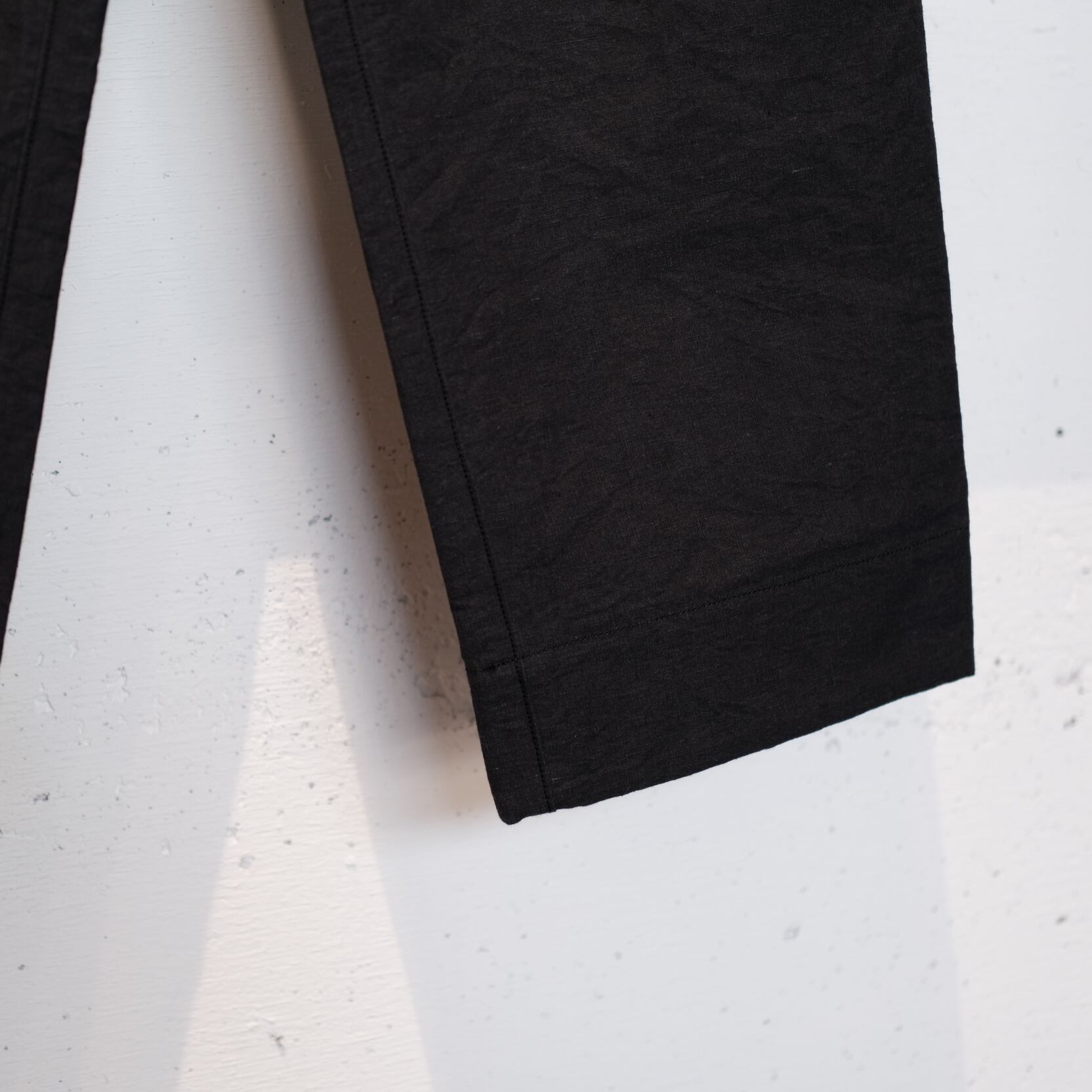 静岡・浜松で旧式のシャトル織機を使用して織り上げられた、高密度の経糸に綿、緯糸に麻(リネン)を使用した織物です。シャトル織機は、最新の織機に比べてスピードは遅いものの、緯糸を一本一本丁寧に打ち込むことで、生地にしっかりとしたコシとハリ感が生まれます。この打ち込みが、麻のさらりとした質感と綿のやわらかさを引き立て、ペーパーライクな軽やかさと強度を両立した生地に仕上がっています。このハリ感により、生地が素肌にまとわりつかず、真夏でも快適に着用できる点が特徴です。