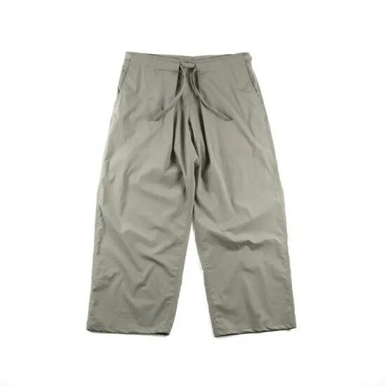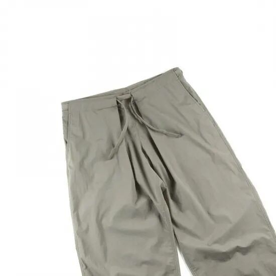 "Crispy nylon stretch ripstop"を採用した"Loose fit pants"。前後身頃にタックを配した、タップリとしたワイドテーパードシルエット。股上を深く設定しており、好みの丈に合わせたウエスト位置で着用いただけます。大きくとったウエストはドローコードをギュッと絞って履く仕様です。両腰にスラッシュポケット、右後に片玉ポケットを配しています。