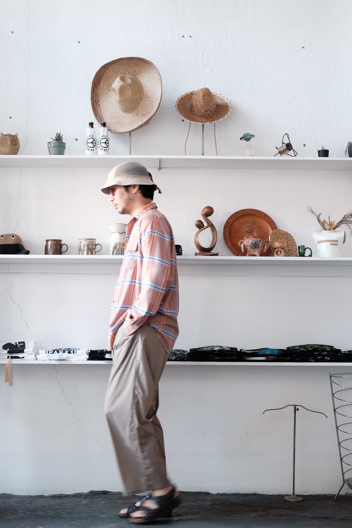"Crispy nylon stretch ripstop"を採用した"Loose fit pants"。前後身頃にタックを配した、タップリとしたワイドテーパードシルエット。股上を深く設定しており、好みの丈に合わせたウエスト位置で着用いただけます。大きくとったウエストはドローコードをギュッと絞って履く仕様です。両腰にスラッシュポケット、右後に片玉ポケットを配しています。