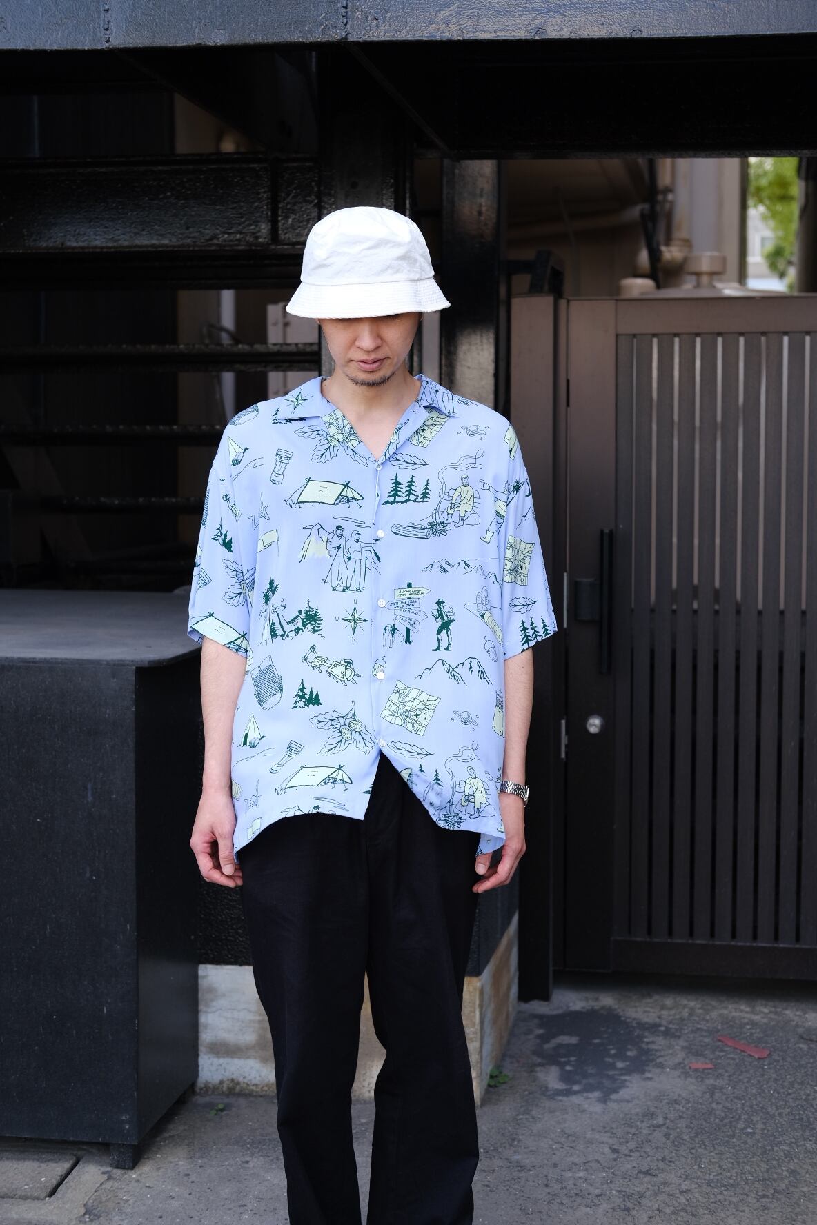 経緯共にレーヨンのスパン糸を使用し、非常に柔らかでトロミのあるアロハ生地。イラストレーターだったり画家だったり、最近は釣り人でトレイルランナーのジェリー鵜飼くんに以前描いていただいた絵柄の色を差し替え再リリース。アロハシャツなのに柄のモチーフは全て山絡みという、ちょっとひねくれたオリジナルアロハです。3色使いのシルクスクリーンは、国内の熟練の職人による手作業によるもの。