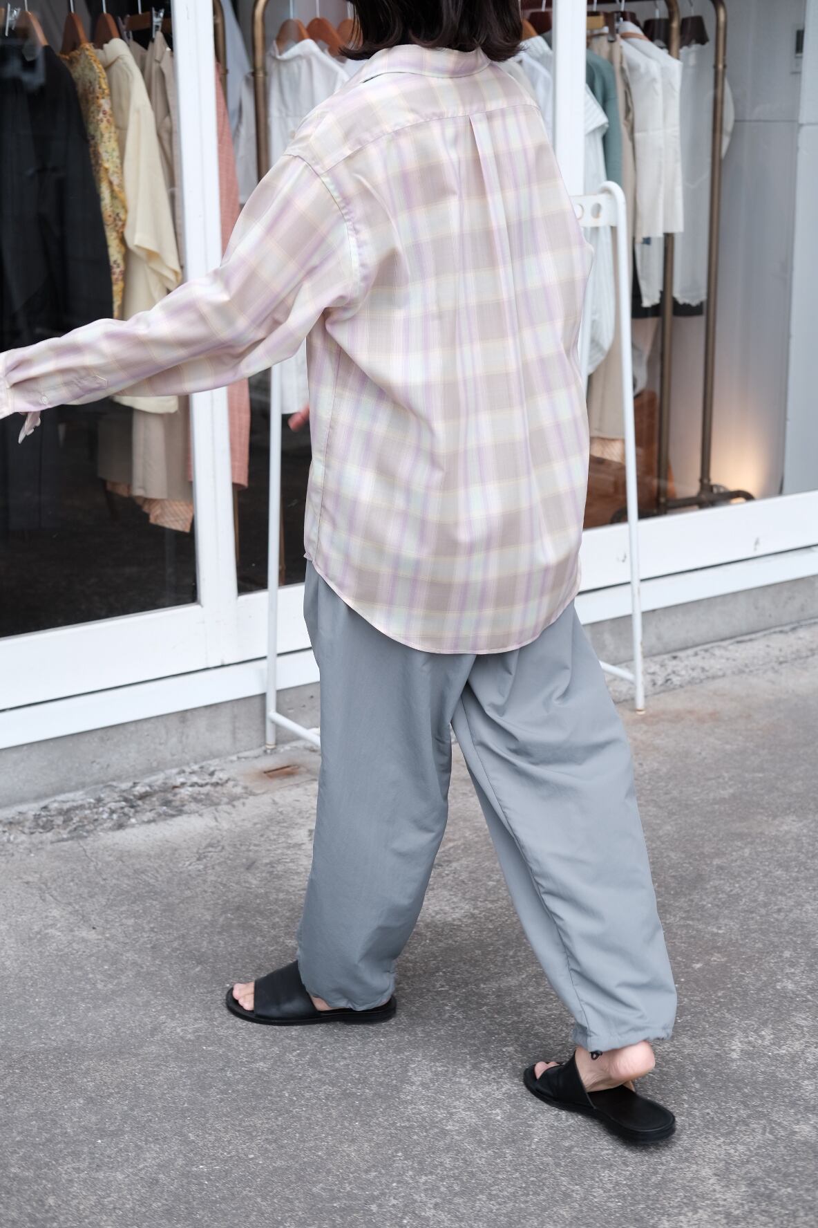 HEALTHで2021年から定番化しているEasy pants #7のサイドのポケットなしタイプ。USの古いスポーツウェアより着想。裾には現代的なアジャストシステム完備。イージーパンツとして最低限のステッチだけを残し工場の負担を軽減し、恒常的に高いクオリティを保つデザインとなっています。