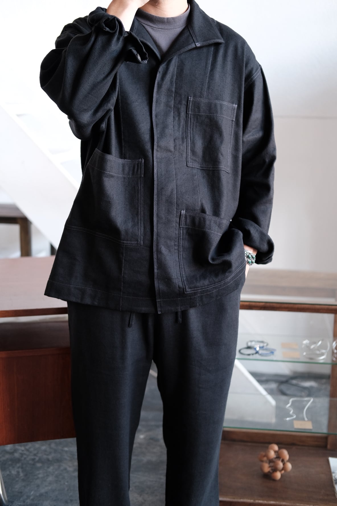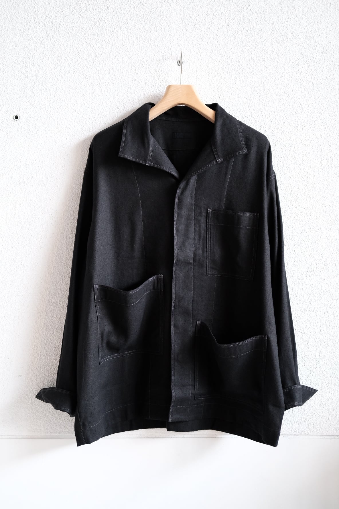 ツールボックスのような機能を持たせた大小三つのポケットが特徴のシャツジャケットです。生地色からわずかにずらした糸色と随所に施したトリプルステッチ、前立ての比翼仕立てによって、全体のステッチワークを際立たせています。ゆとりあるシルエットは素材感と相成って、長い季節インナーとしてもアウターとしても活躍します。