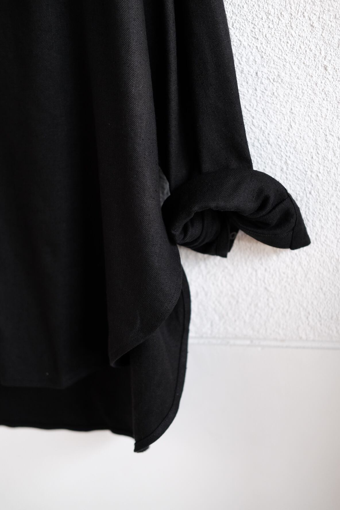 身幅を広めに取ったしっかりとしたボリューム感のあるプルオーバーシャツです。前立ての下から大きくタックをとり、身体とのゆとりを保つと同時に生地の綺麗な波打ち感を強調しています。タックインのしやすさを考慮し、裾は丸くカーブしたシルエットを採用しています。