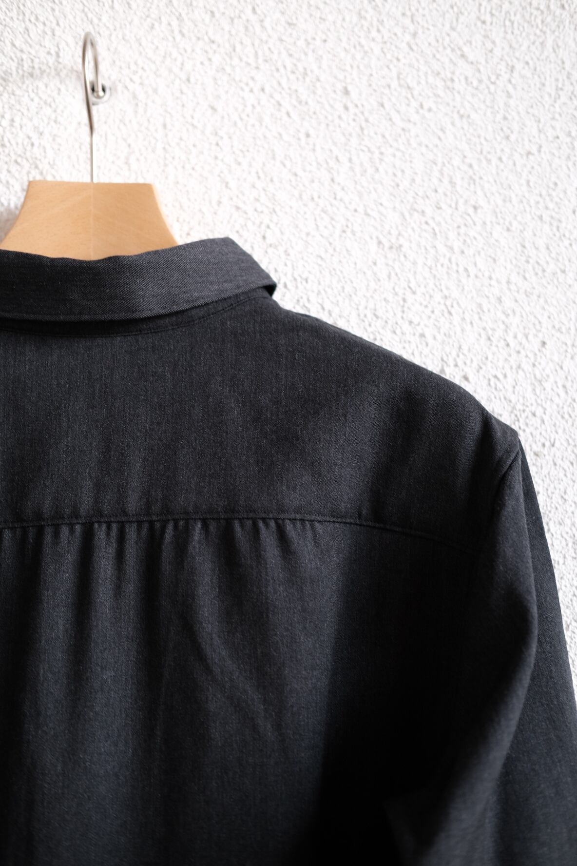 シャツは現代の民族服を構成する洋服としての提案になります。構成は洋服のルールに則りながら、極力デザインを削ぎ落とし、機能性に基づいたパターンメイクとしています。具体的には袖山をいせ込み、袖底を高めに設定することで腕周りの運動量を、背中のヨークにタックやギャザーではなく、いせを入れることで背中の運動量を確保しています。ボタンは貝ボタンを使用しています。