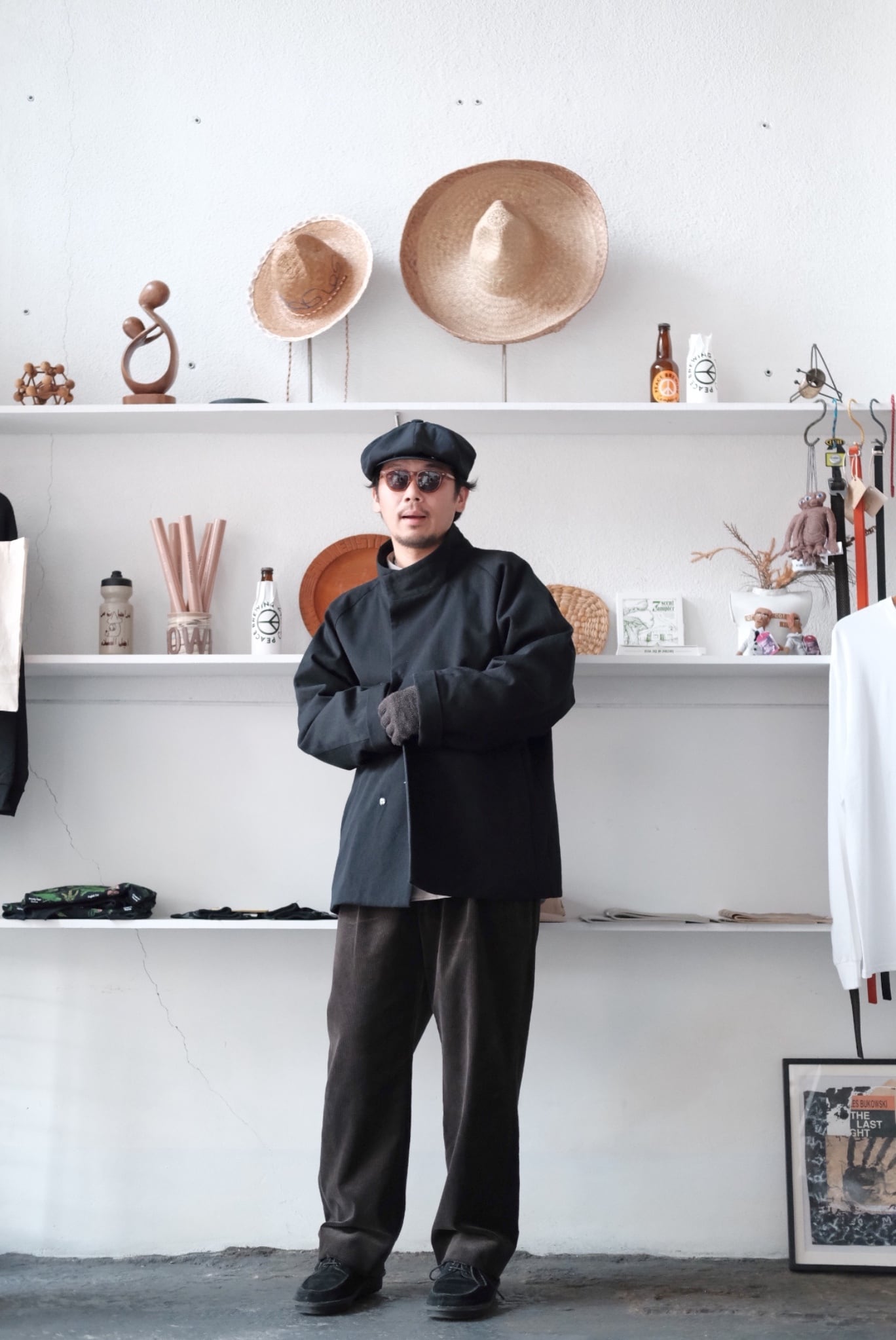 背面はヨークから袖にかけて裁ち出し、前身頃はラグランスリーブ、脇部にはマチを配すなど、可動域を重視した機能的なパターンを随所に採用しています。ポケットは布の切り替えを活かしたデザインとし、ボタンには外部から見えないスナップボタンを用いてミニマルにまとめました。表地の緯糸と同じく、裏地にもオーガニックコットン100%の生地を使用しています。