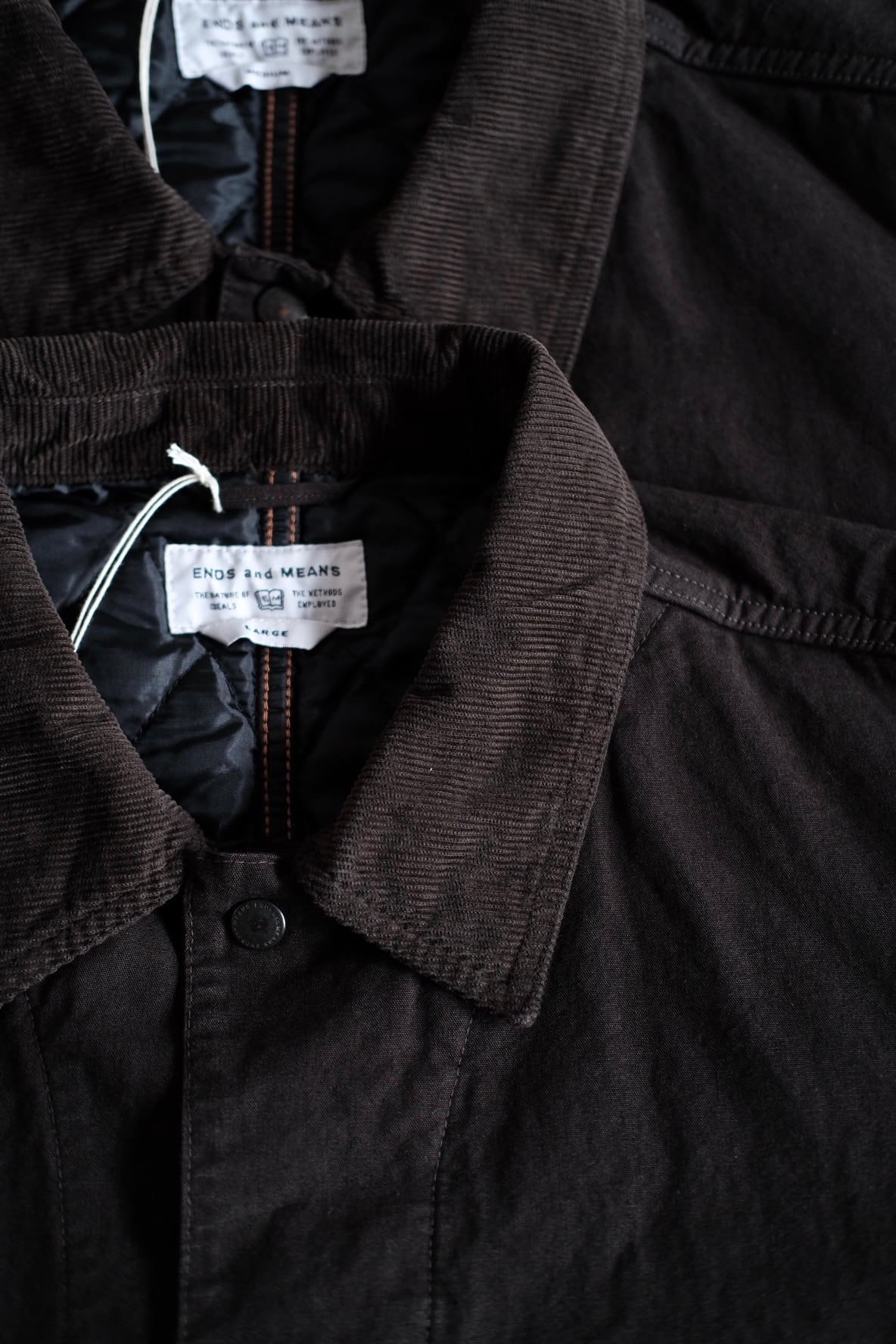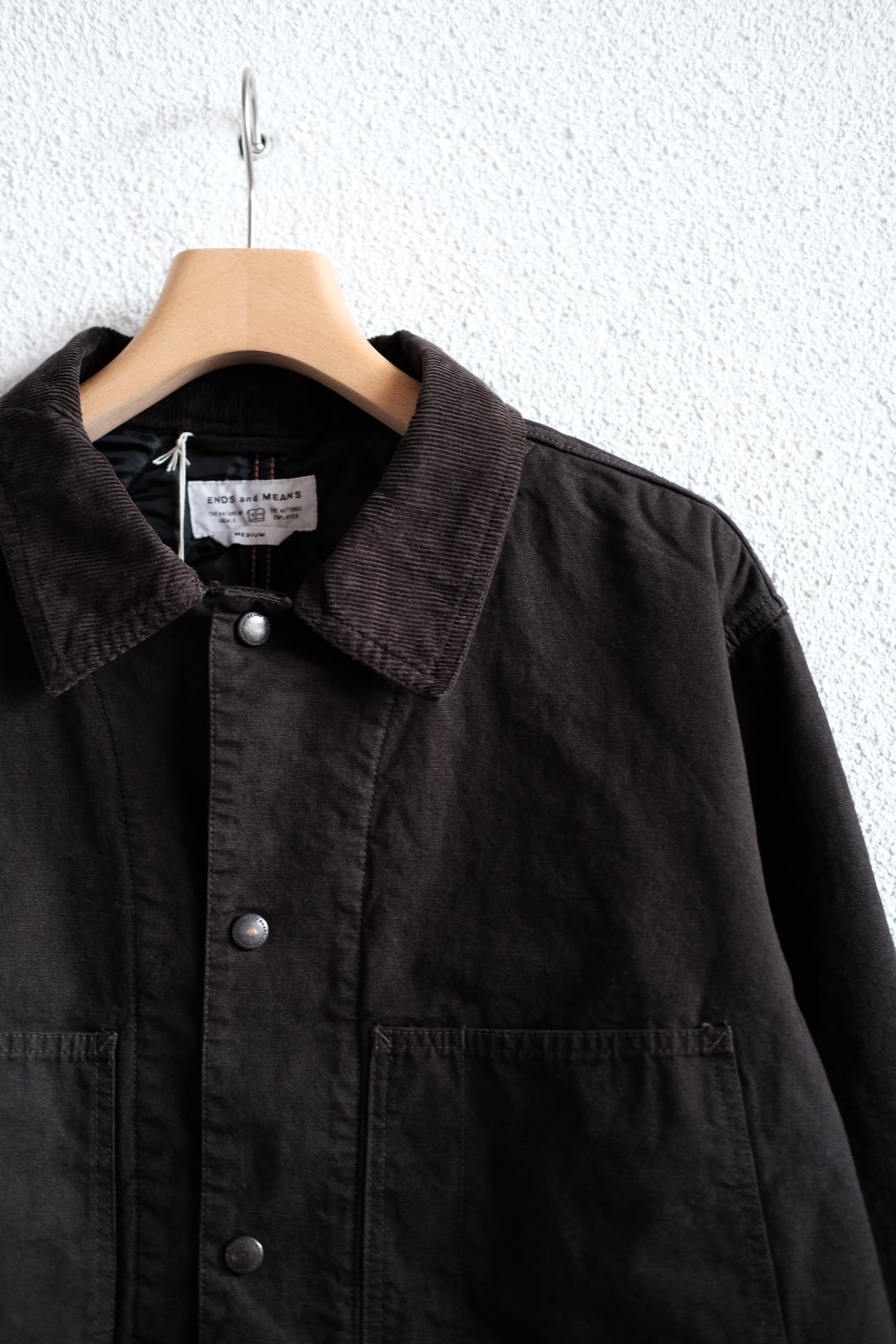 通常のキャンバス生地よりもしなやかで品がある強撚オーガニックコットン糸で折り上げたキャンバス生地を使用。襟はコーデュロイ生地。内側には程よい厚さのキルティングライニング。