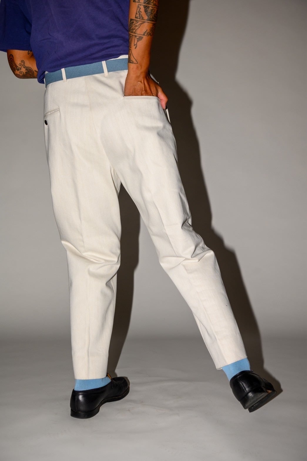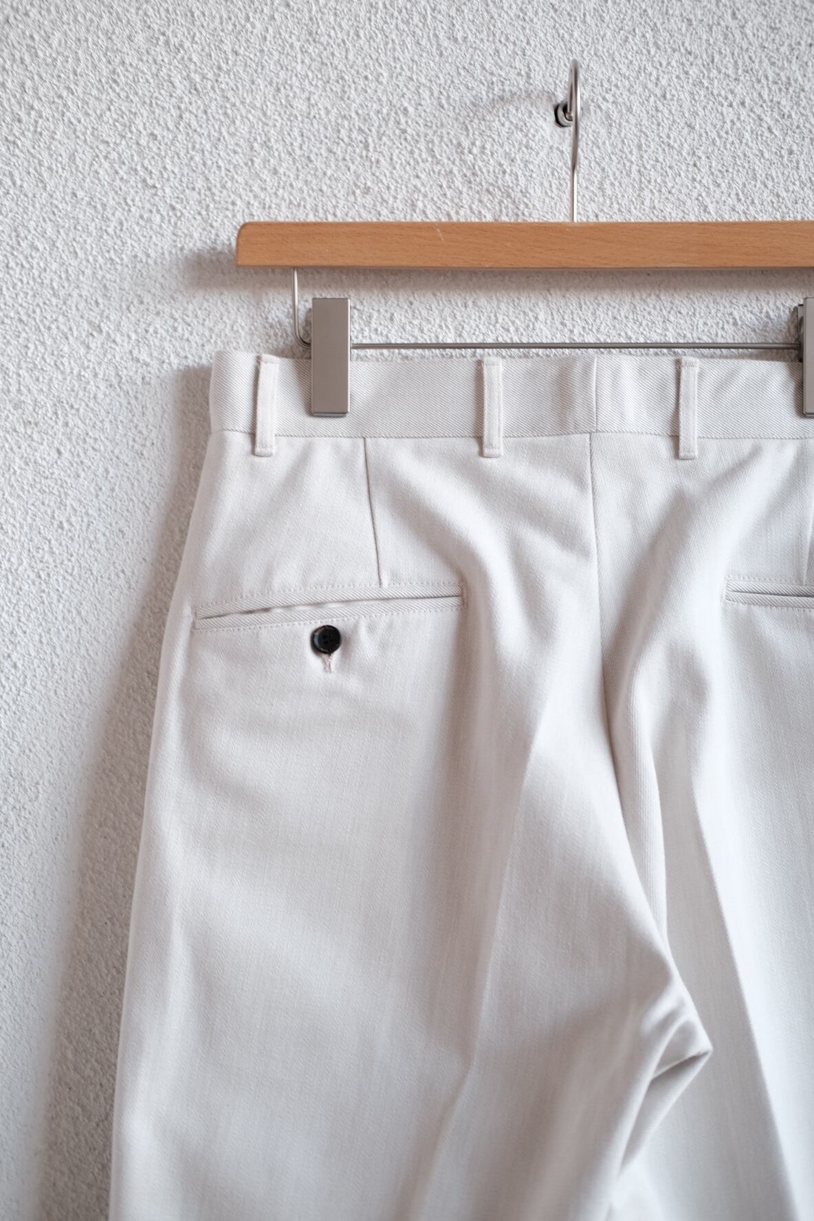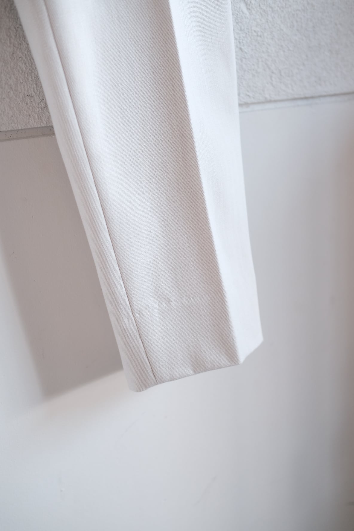 定番のトラウザーが入荷しました。今回は潔い真っ白のカツラギ生地になります。デニムのような生地に近いですが、デニムより柔らかく最初から穿きやすいのが特徴です。長く穿き込んで多少の汚れも気にしないぐらいがかっこいいパンツだと思います。