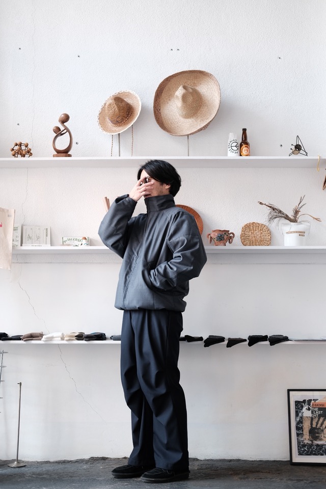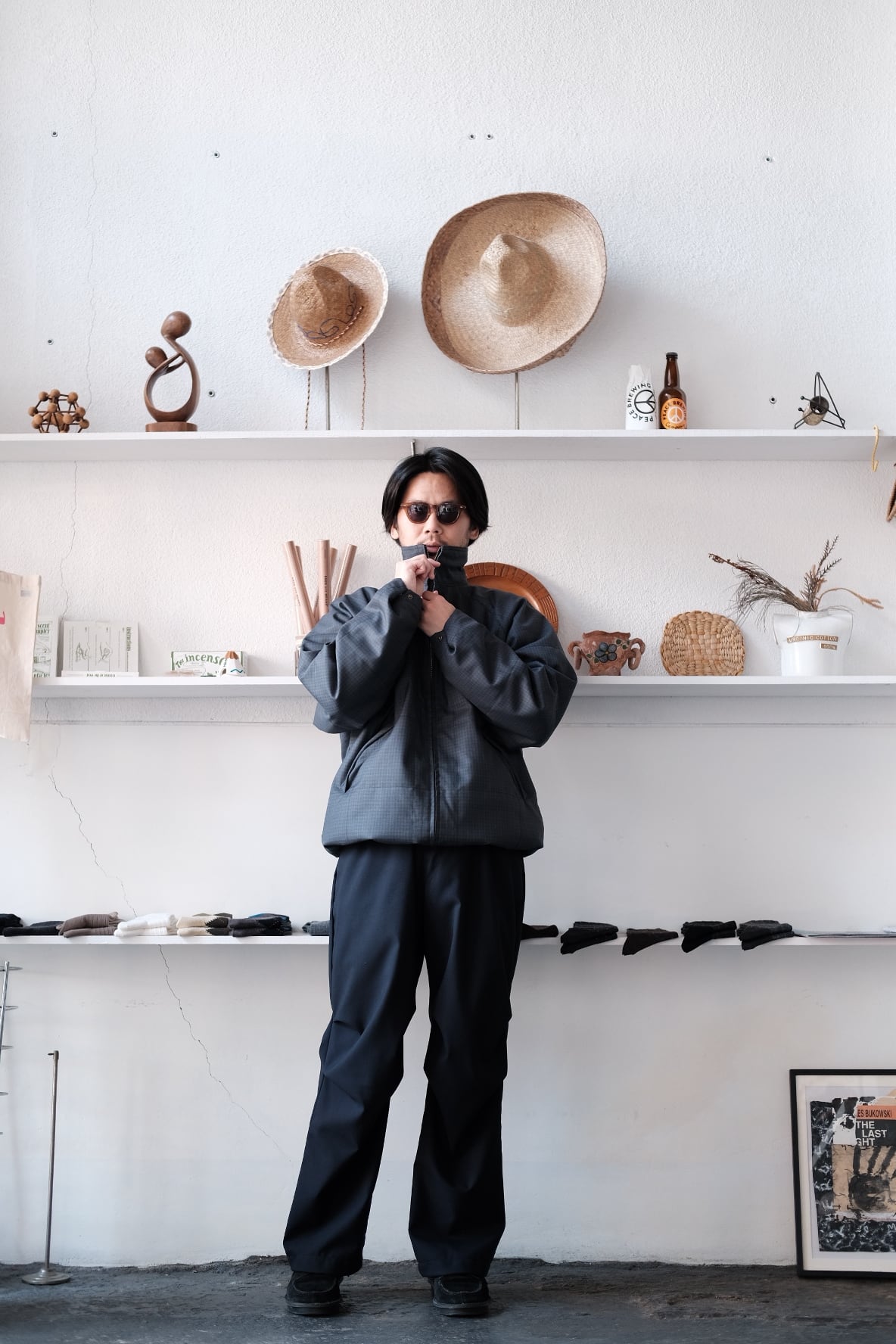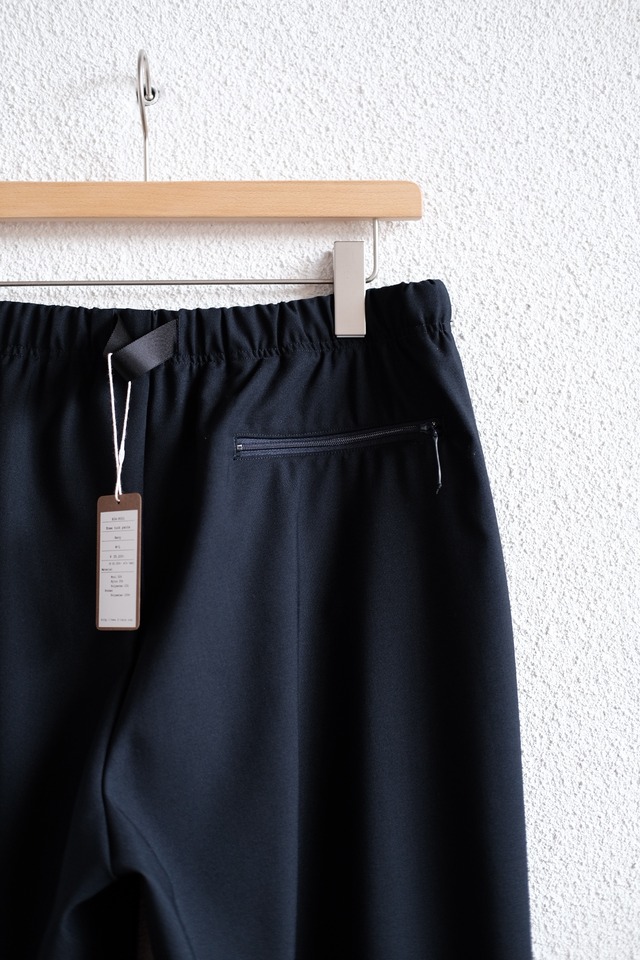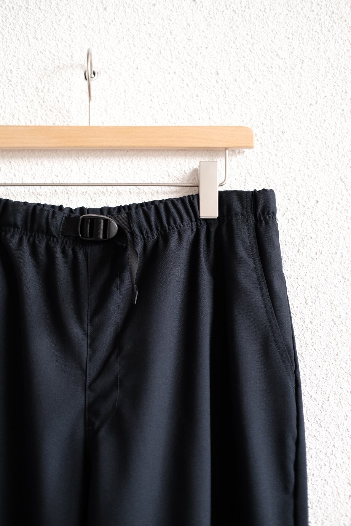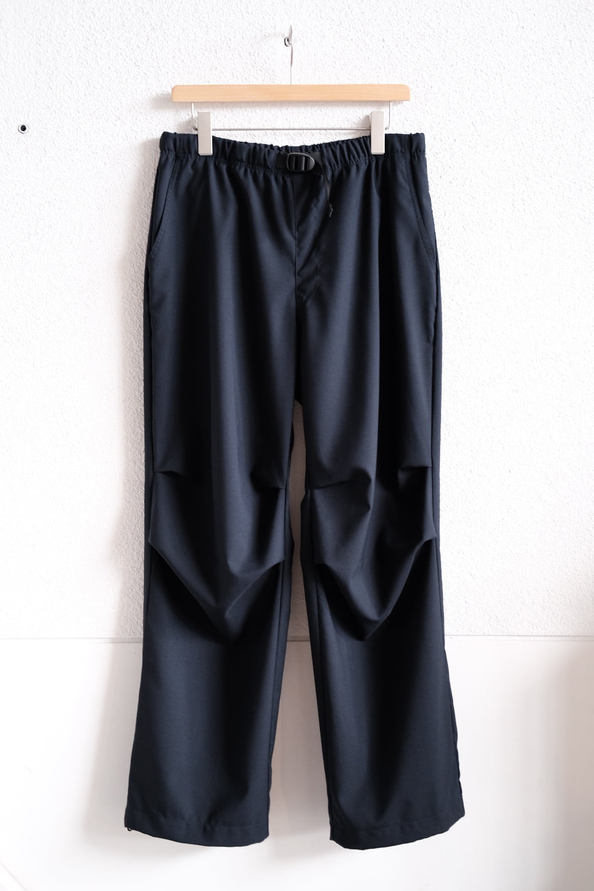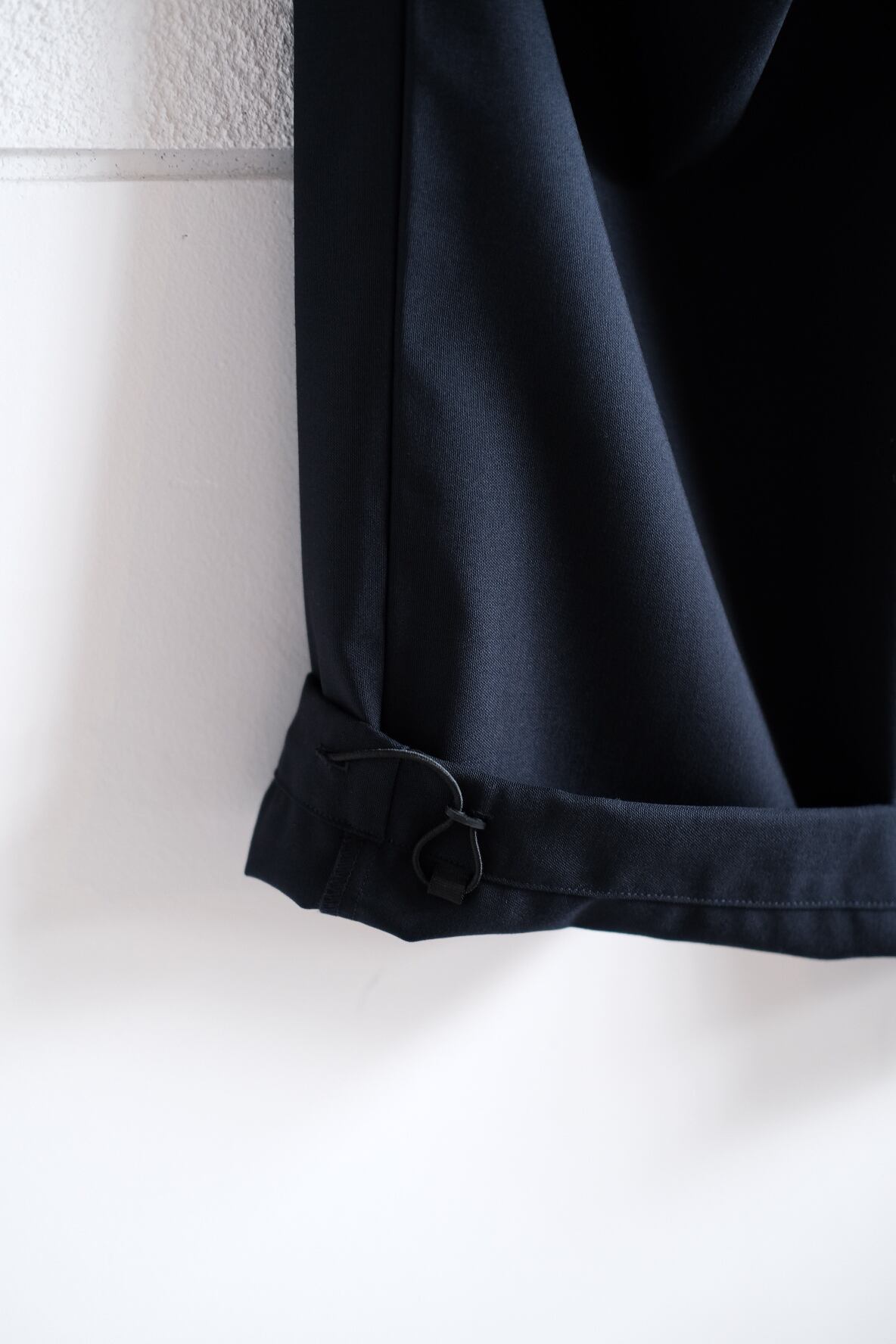 "CORDURA COMBAT WOOL"を採用した" Knee tuck pants"。ミリタリーパンツをベースにしたタップリとしたワイドシルエット。深めにとった股上に、ゴムとアジャスターベルトつけたウエスト、快適な履き心地です。裾を絞って着用できるよう、ゴムスピンドルを内蔵しています。