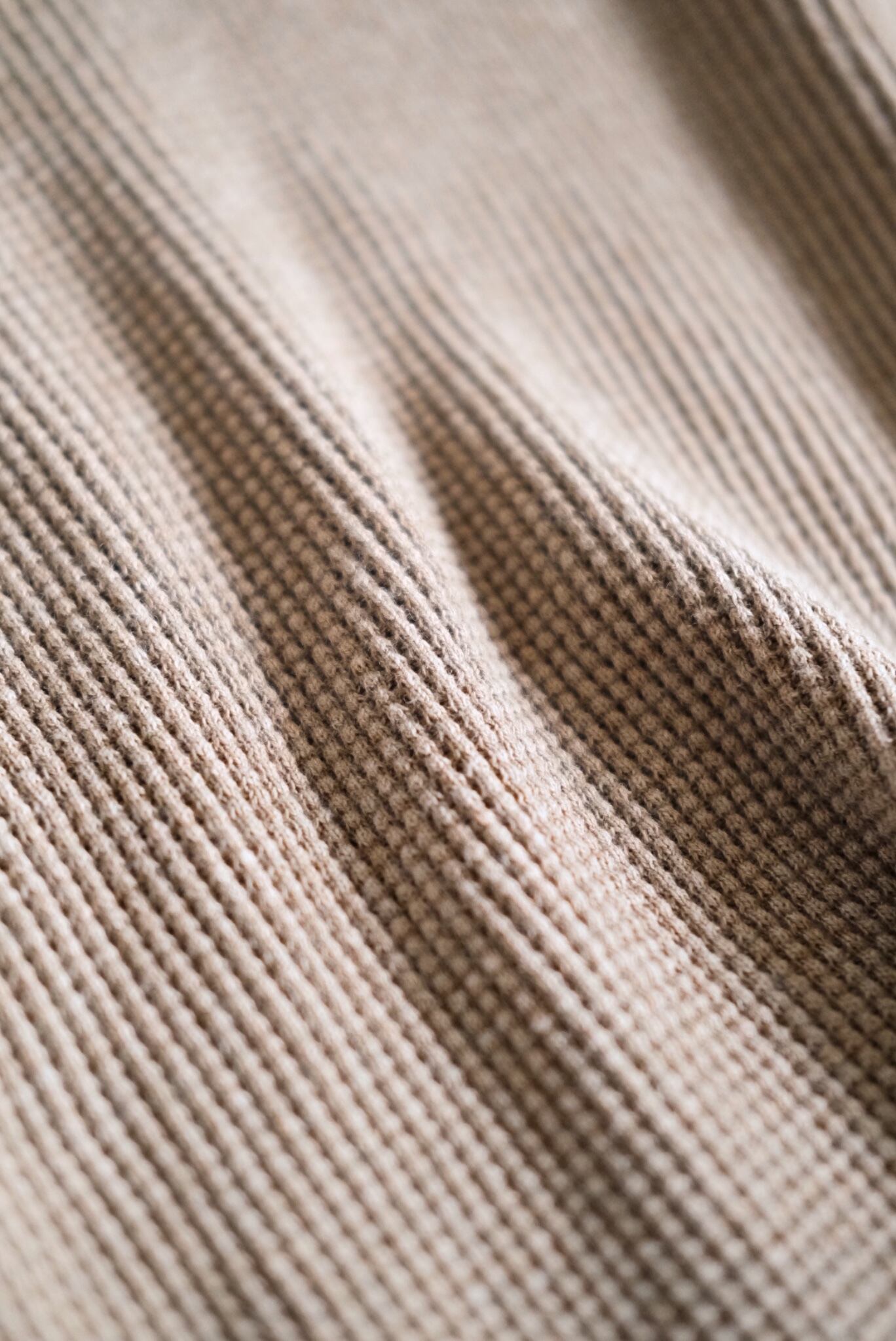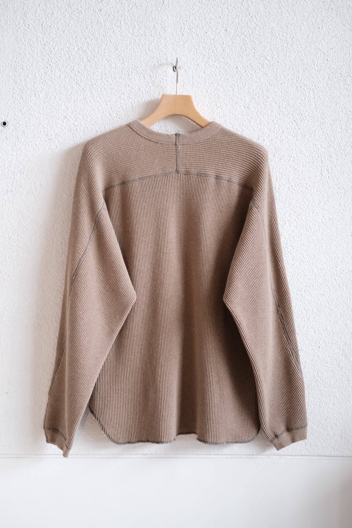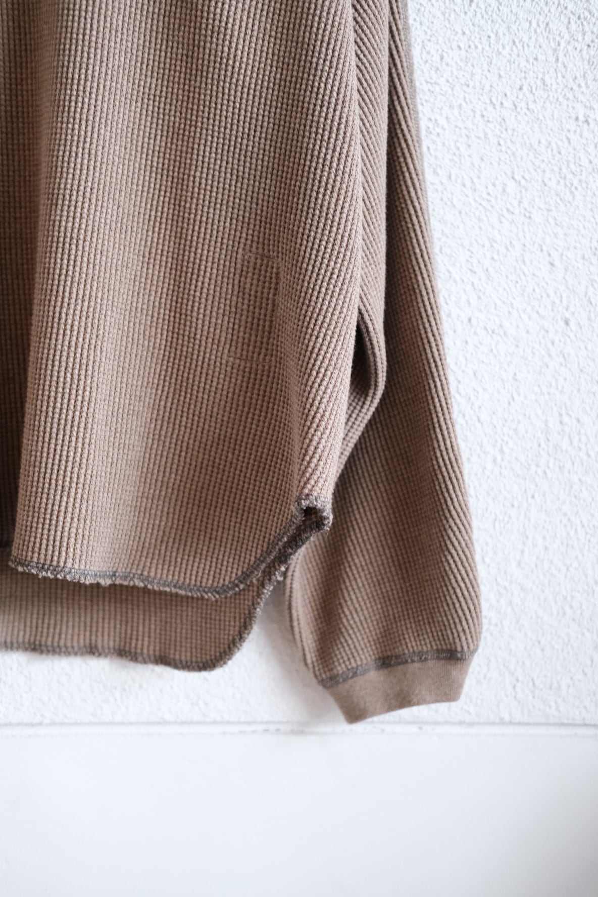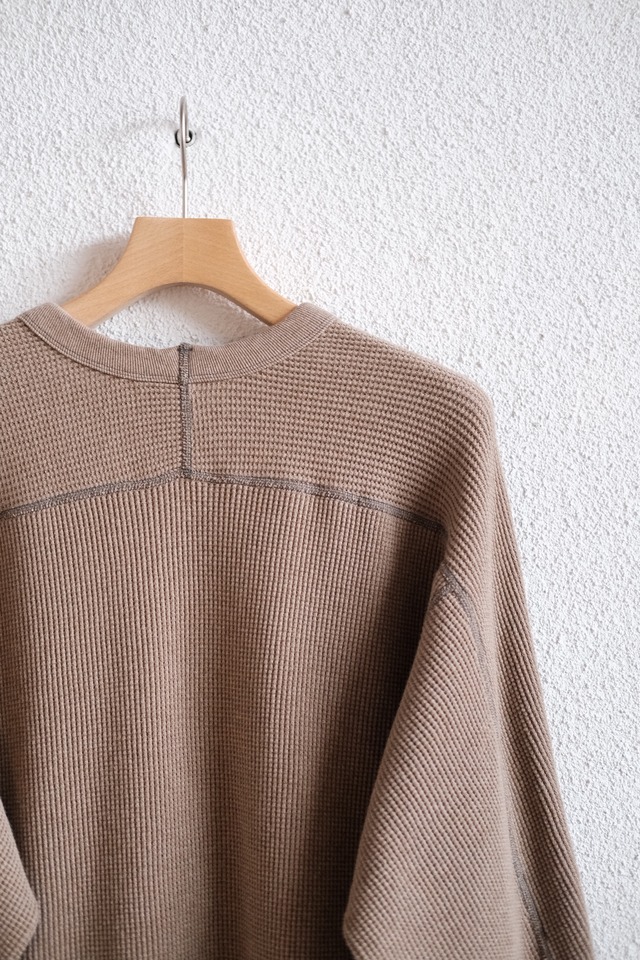 空紡糸を使ったシャリ感のあるコットンワッフルのドライな質感と4本針のフラットシーマで縫製したパターンカットデザインが特徴なサーマル。一枚で着てもインナーにしても重宝するので、秋冬春と長い期間着用可能。着てると伸びますが、タンブラー乾燥で縮ませると元の丈に戻ります。※ タンブラー乾燥による縮みの程度は機械や環境等によって変わるため、予めご理解の上、お好みで使用ください。