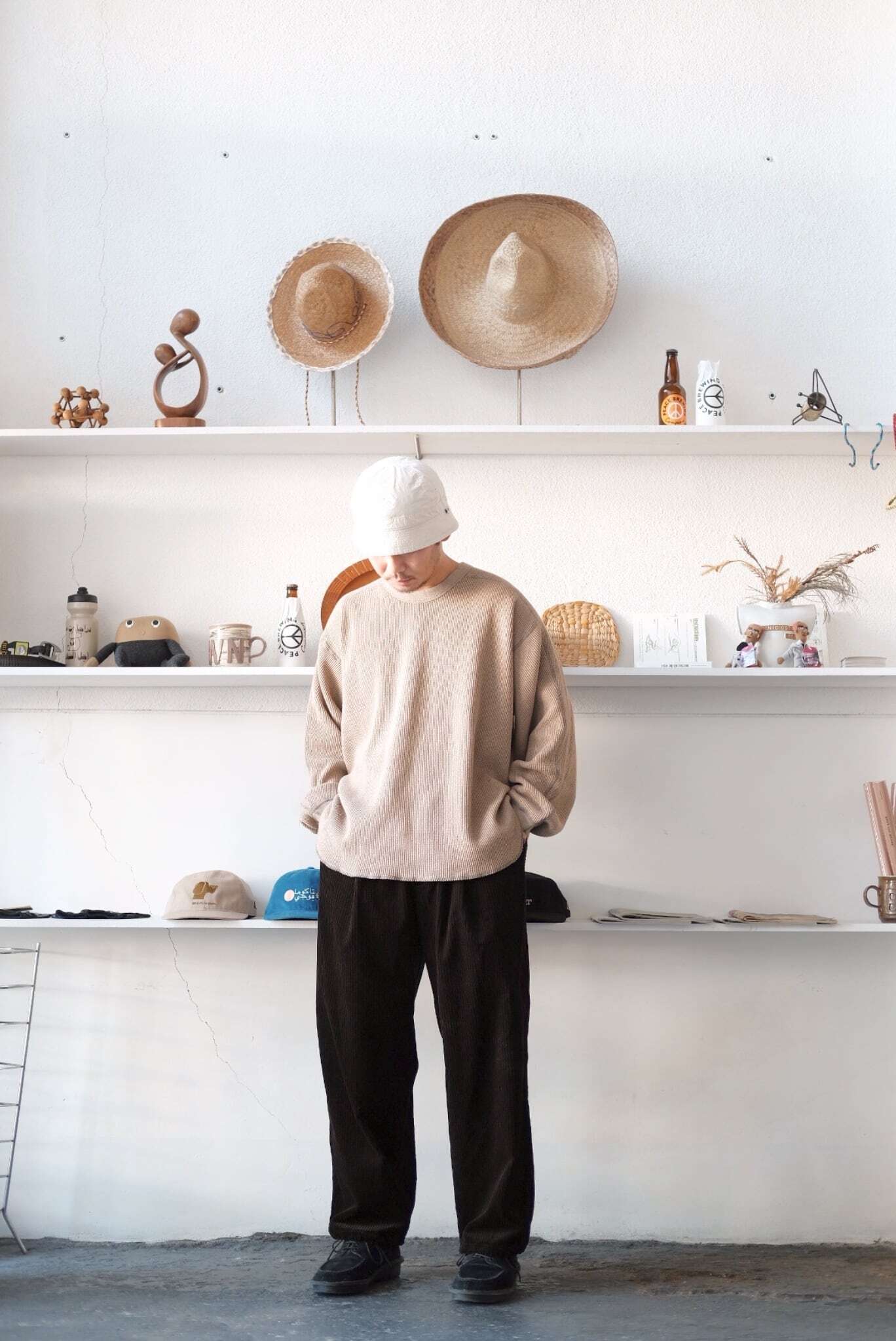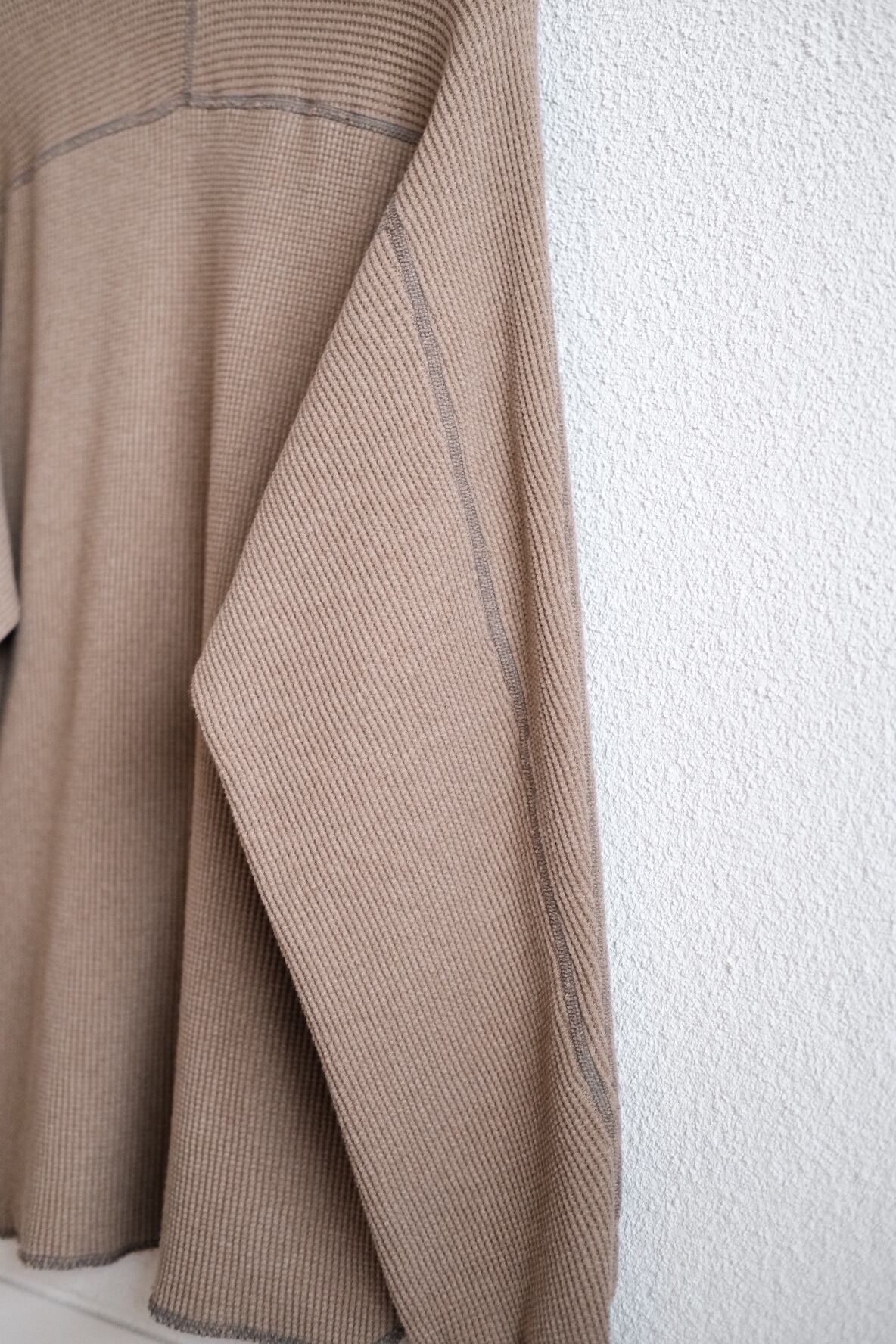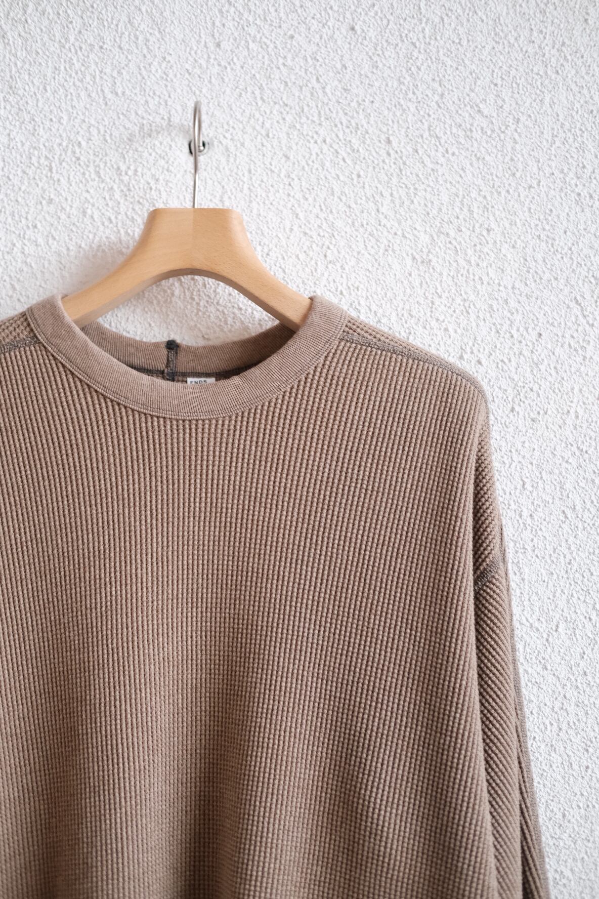 空紡糸を使ったシャリ感のあるコットンワッフルのドライな質感と4本針のフラットシーマで縫製したパターンカットデザインが特徴なサーマル。一枚で着てもインナーにしても重宝するので、秋冬春と長い期間着用可能。着てると伸びますが、タンブラー乾燥で縮ませると元の丈に戻ります。※ タンブラー乾燥による縮みの程度は機械や環境等によって変わるため、予めご理解の上、お好みで使用ください。