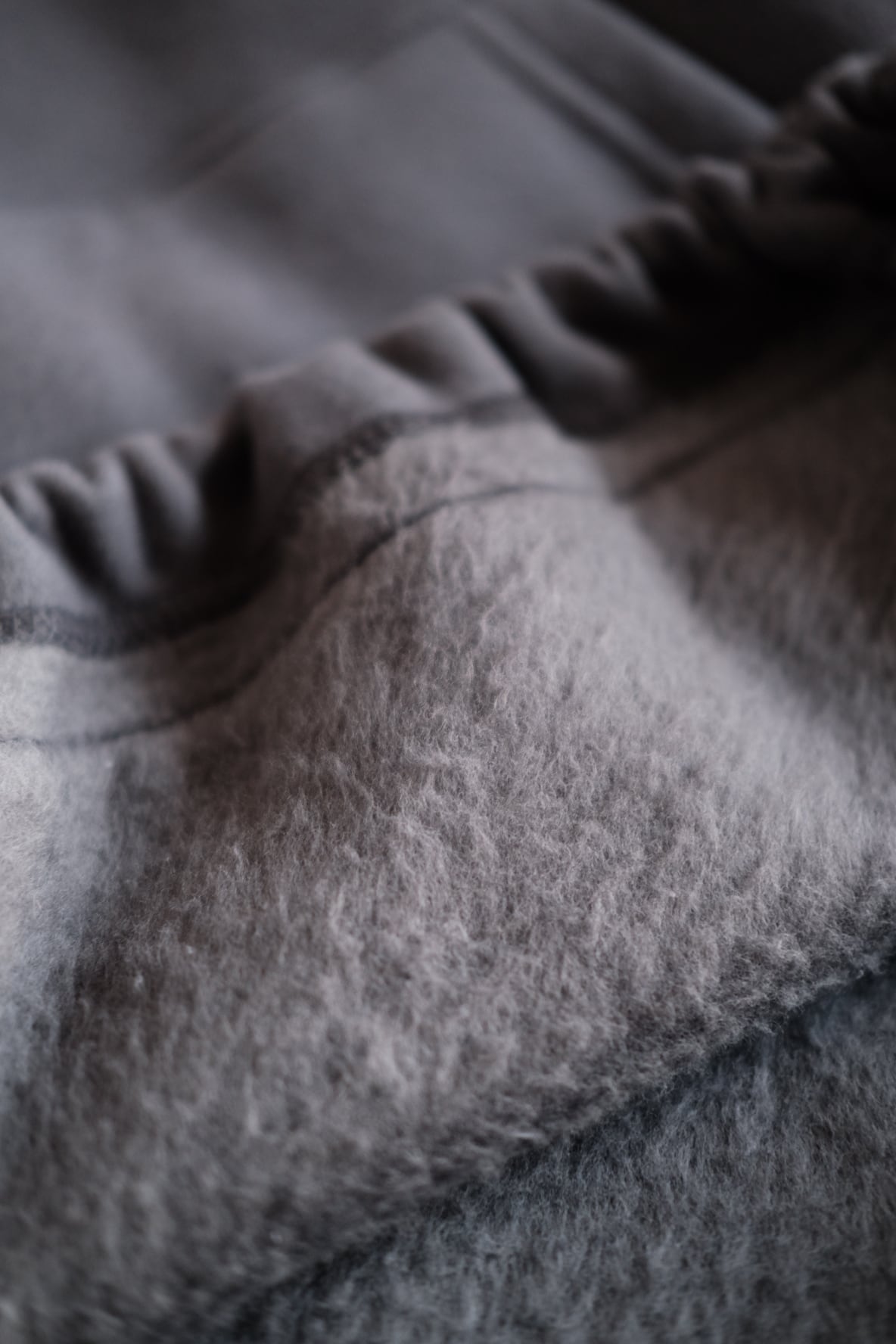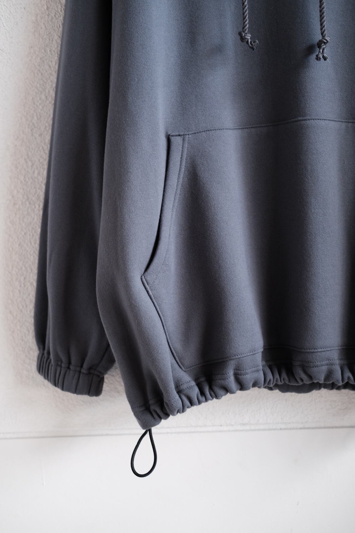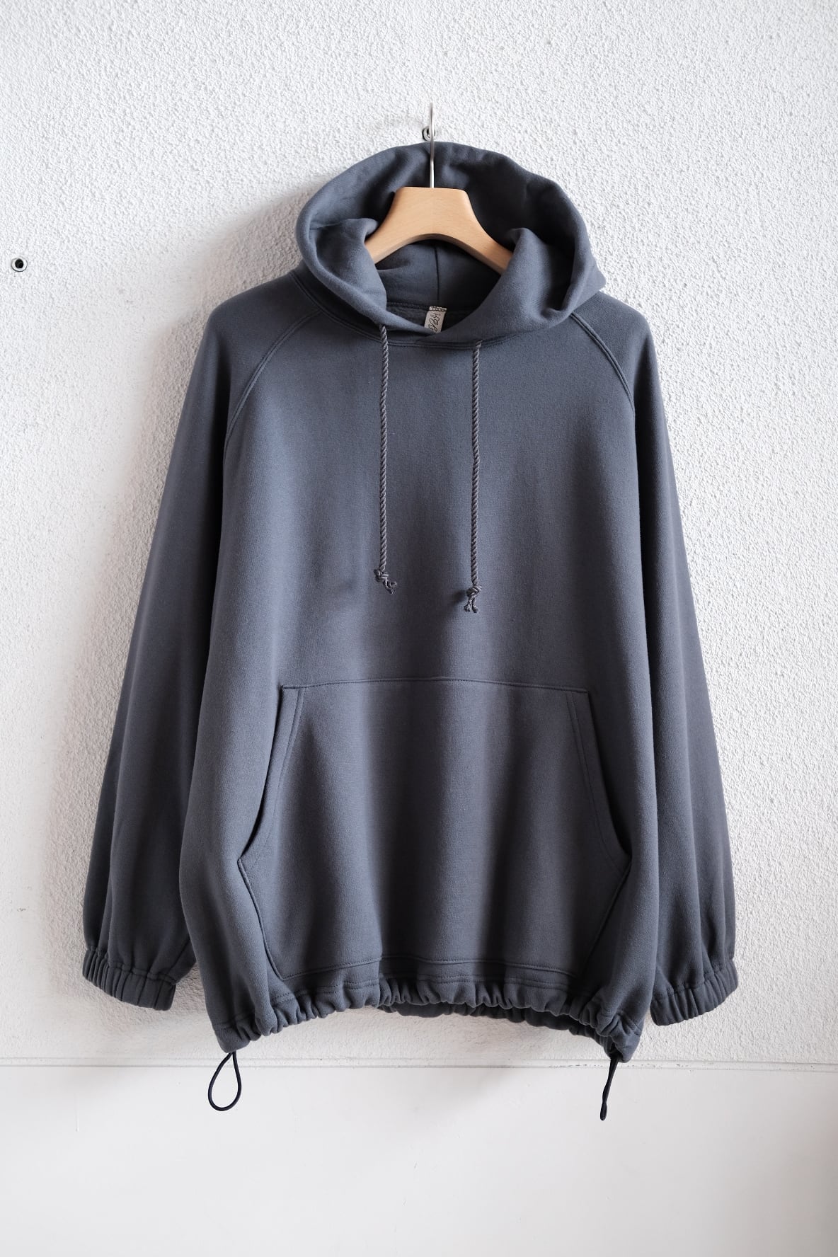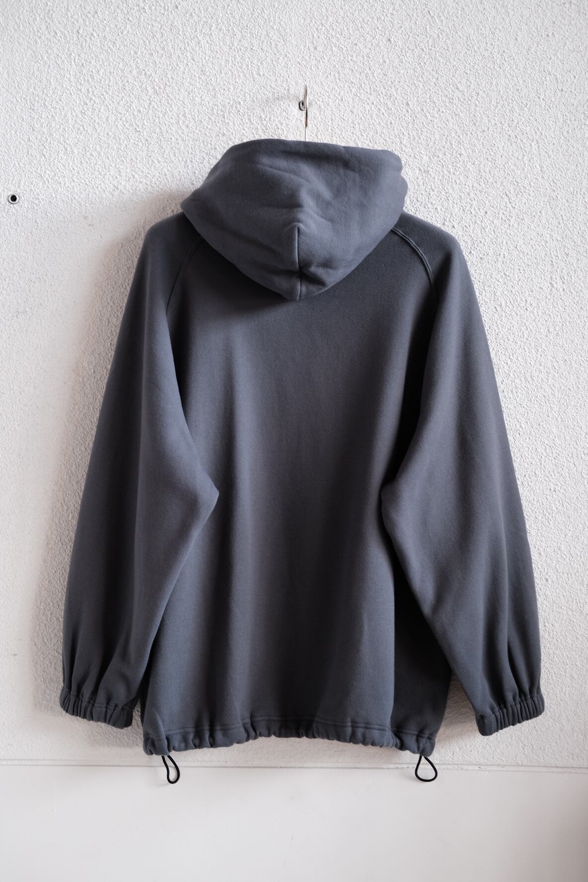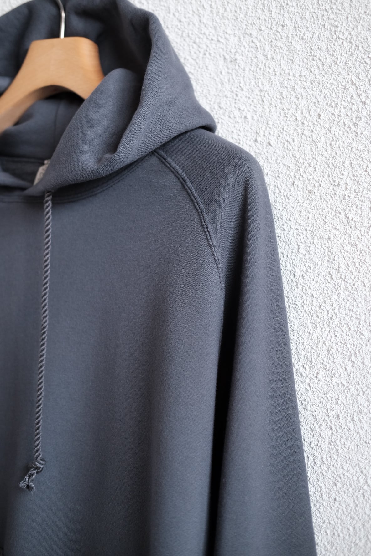 90sらしい大ぶりなシルエット。リブを排除することによりスェットはもちろん、布帛でのフーディの可能性を提案いたします。最低限のステッチワークで、恒常的にクオリティを保つデザインになっています。