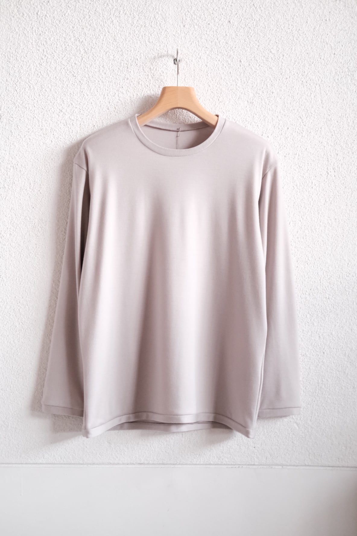シンプルなデザインながら、衿、袖口、裾には生地の地の目を変える工夫を施し、伸びにくい仕様にしています。そのため、通常のフライス素材のように経年変化で伸びきってしまうことがなく、長く着用していただけます。半袖のT-34よりも、若干タイト目のシルエットになっています。