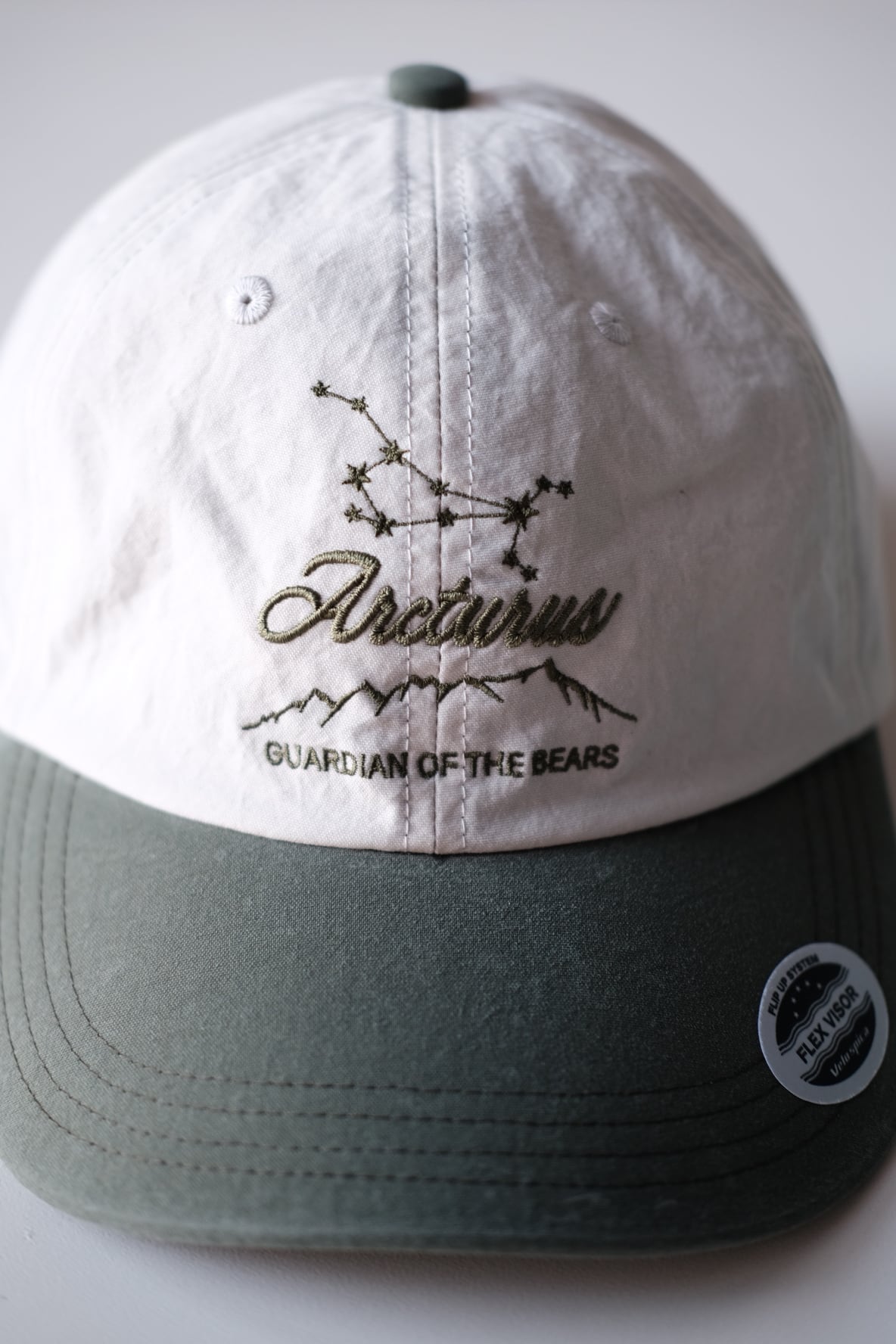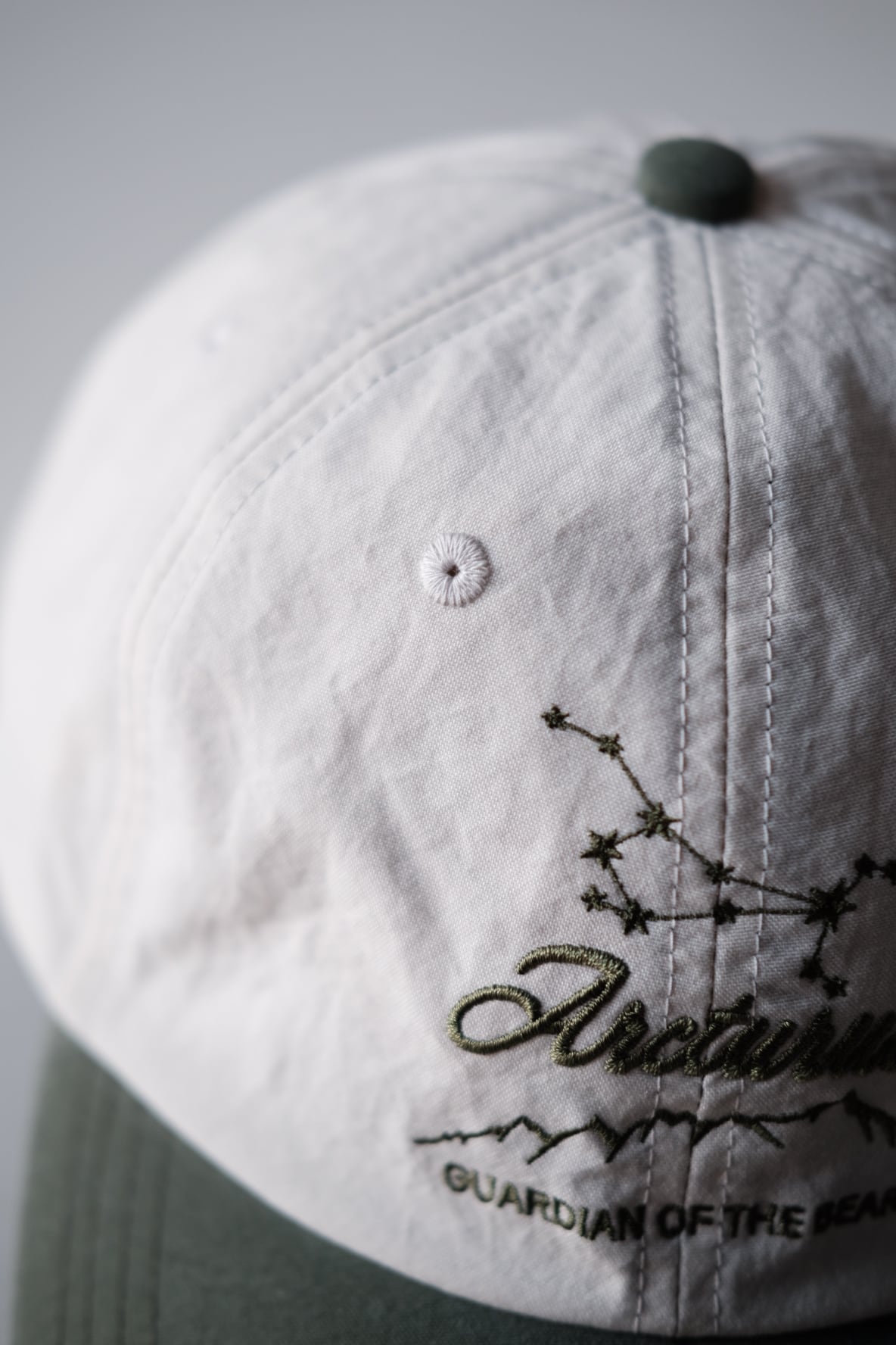 フロントの刺繍デザインは、うしかい座の一等星『Arcturus』(アルクトゥールス)をモチーフにしました。アルクトゥールスは春の夜空に一際明るく輝くオレンジ色の星で、スピカ、デネボラ、と合わせて春の大三角形の一角を成す星です。またこの星はギリシア語で“熊の番人”という意味を持ちます。山や渓流に行く際の“お守り”になれば、という想いを込めて作りました。ここで言う“お守り”とは、それ自体が身を守ってくれる魔法のアイテムではなく、注意喚起を促すものだと考えます。動物たちの領域に、あくまでも、私たちがお邪魔するのだと言う自覚を忘れずにいたいものです。GUARDIAN OF THE BEARS の刺繍文字の上の山の輪郭線は、地元東京の西の果て、高尾山から陣馬山縦走路の標高を元に図案化しました。2026のコレクションテーマとなる、『L.Y.L.N : Love Your Local Nature』から着想を得てデザインされています。
