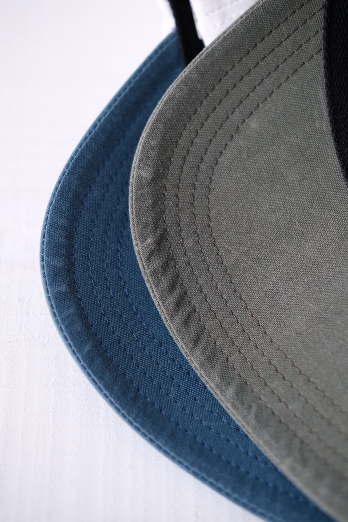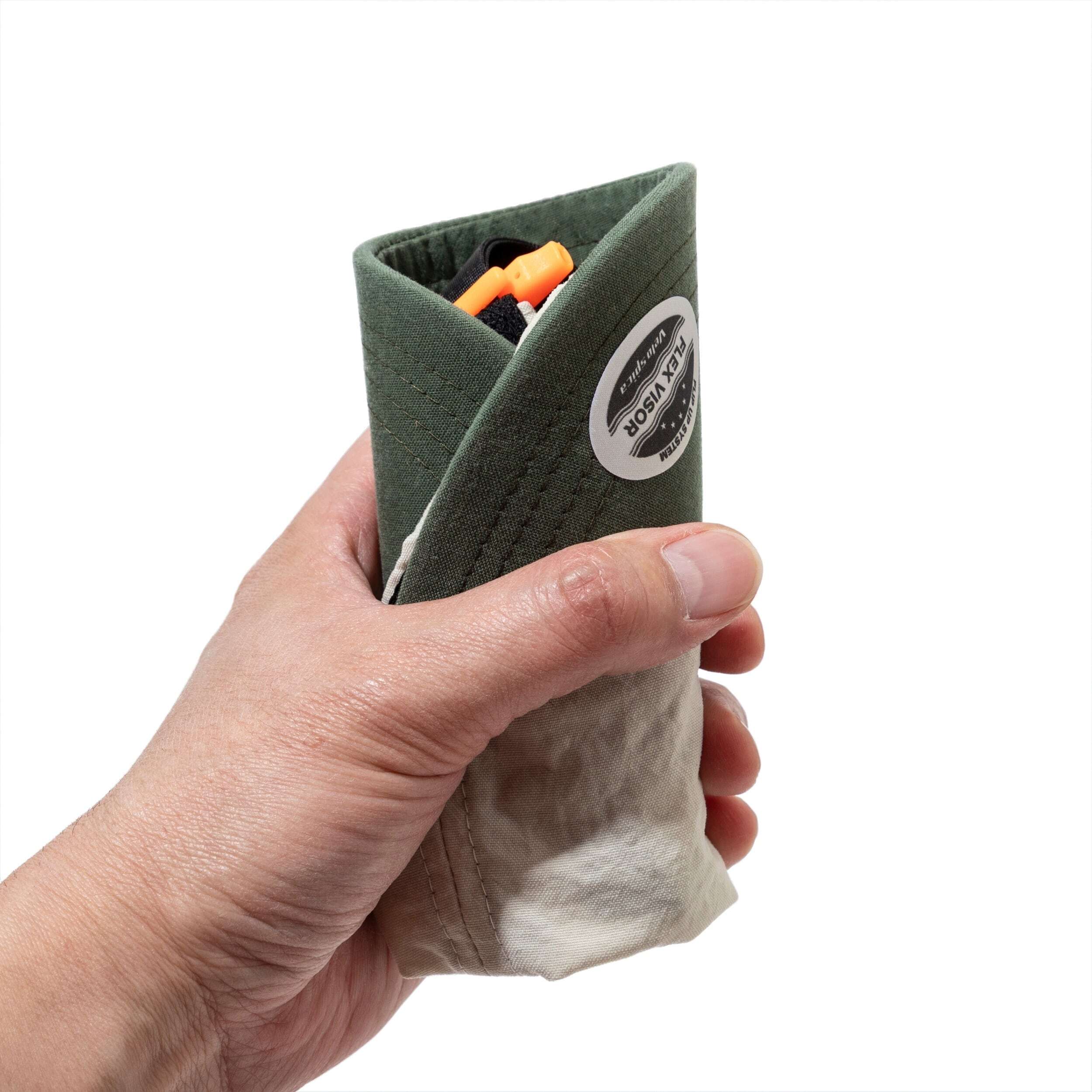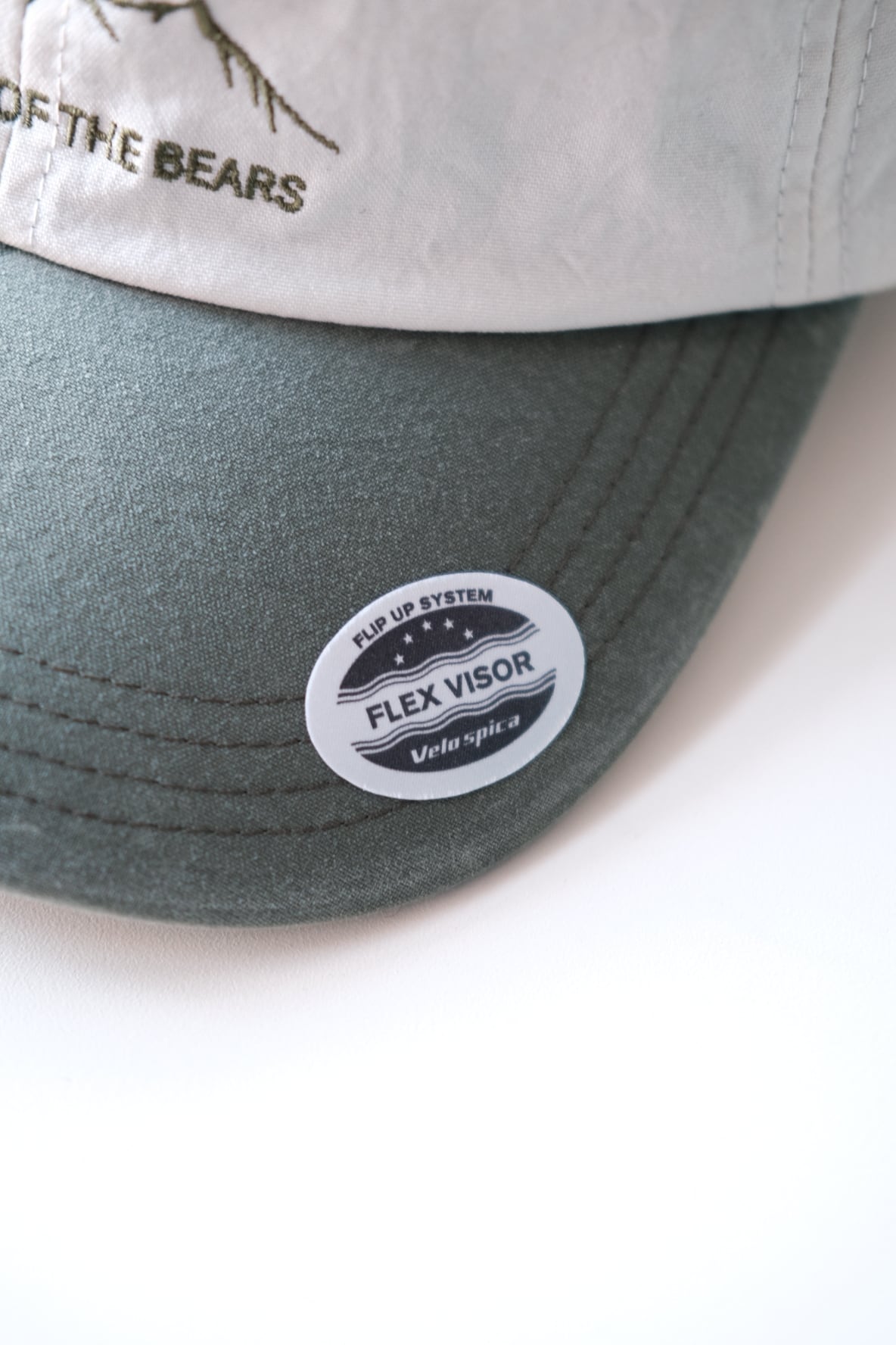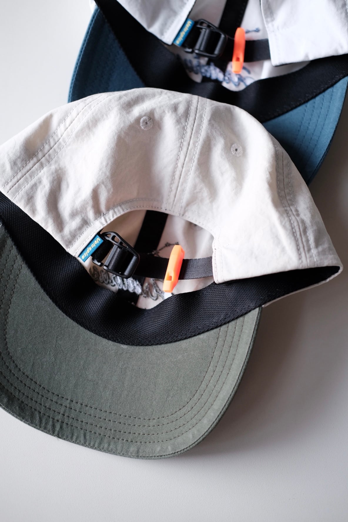 ボディはコットンライクな風合いが特徴のタスランナイロンを使用しています。軽量で耐久性に優れ、撥水性も備えた生地です。ツバにはナイロン生地用に特別に開発したウォッシュ加工が施されており、自然なヴィンテージ感が魅力です。ツバは定番の、柔らかく折りたたむ事も出来、かつ形をキープさせやすい特殊な加工が施されたフレックス・バイザーを採用しています。今回はカーブした型を最初からつけてあります。柔軟性のあるツバとナイロン生地のウォッシュ加工の組み合わせは、まだどこのブランドもやっていない初の試みだと思います。またvelo spica のツバの特徴でもあるフリップ・アップ(視界を広げたい時にはツバを上に跳ね上げる)して被ることも可能です。背面にはテープのバタつきや、抜け出て来るのをおさえるホイッスル付きストラップキーぱが付属しています。山で熊の痕跡を見つけた時は、角笛を吹く牛飼いの様に、このエマージェンシーホイッスルを吹いて警戒にあたるのも良いかも知れません。そして今回から背面のアジャやスターが簡単に取り外せるフック型を採用しています。バックパックのコードなどに気軽にひっかける事が可能になりました。