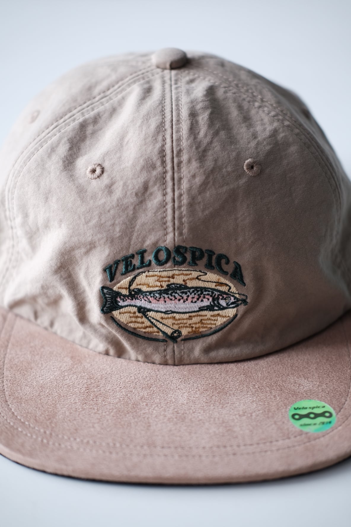 オーソドックスな6パネルデザインでありながら、ツバ表面をスエード調ヴィーガンレザー(フェイクレザー)に切り替えることで、ヴィンテージのフィッシングキャップの雰囲気を表現したコンビネーションキャップです。ポリエステル100%のヴィーガンレザーは洗濯も可能ですのでリアルレザーと比べお手入れも簡単です。