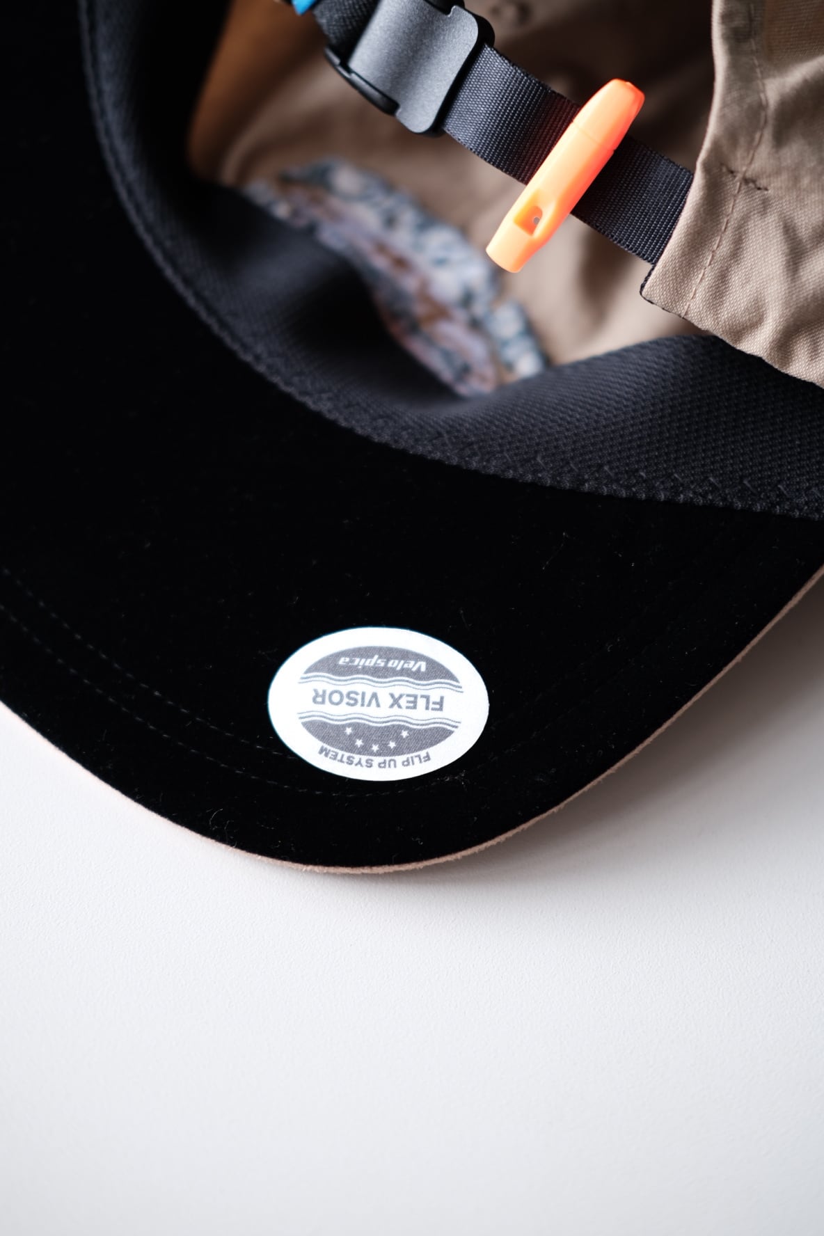 ツバは前回同様、柔らかく折りたたむ事も出来、かつ形をキープさせやすい特殊な加工が施されたフレックス・バイザーを採用しています。またvelo spica のツバの特徴でもあるフリップ・アップ(視界を広げたい時にはツバを上に跳ね上げる)して被ることも可能です。カメラのファインダーを覗く時やヘルメットの下、クライミングなど、ちょっとしたタイミングでフリップ・アップが役に立ちます。水に浮く素材なので水辺の遊びにも。