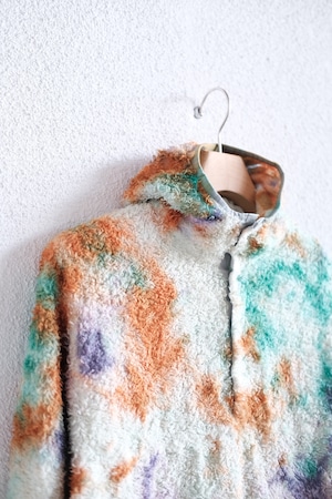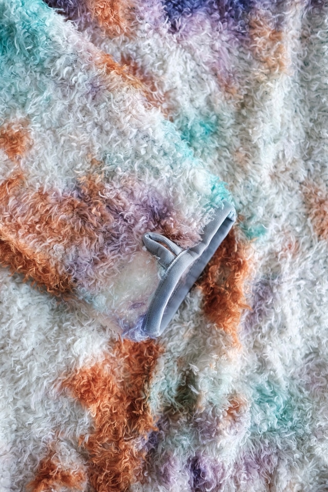 米国ポーラテック社が開発した"POLATEC ALPHA"。通気性とストレッチ性を両立するメッシュ生地をベースに、化繊綿を編みこむことで保温力を持たせたインサレーション素材。毛足のあるフリースのような見た目ですが、濡れても保水せずに速乾性にも優れています。リサイクルポリエステルを使った120g/m2厚のPOLATEC ALPHAをセレクトしました。縫製後に、4回の絞染でタイダイ風に仕上げました。