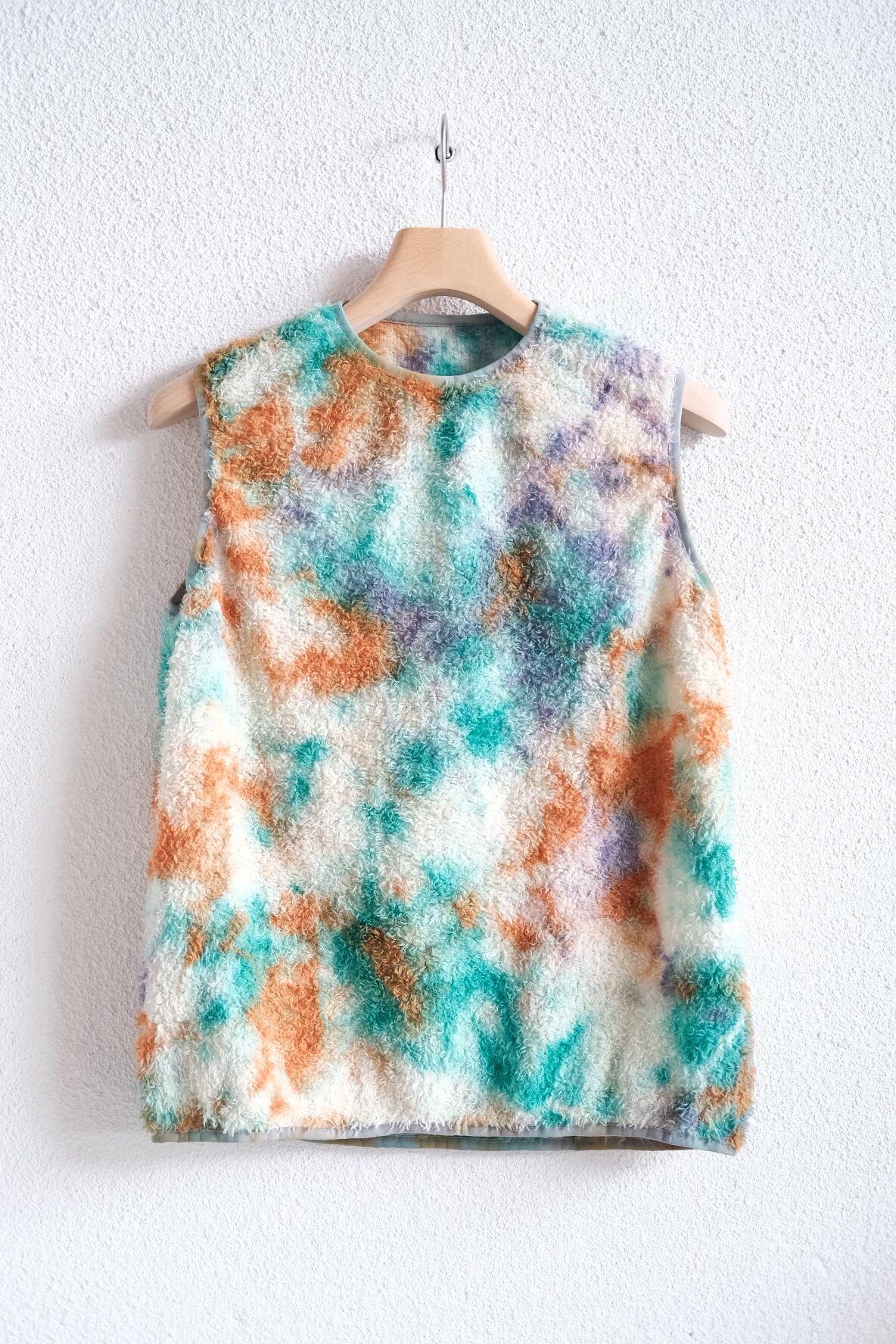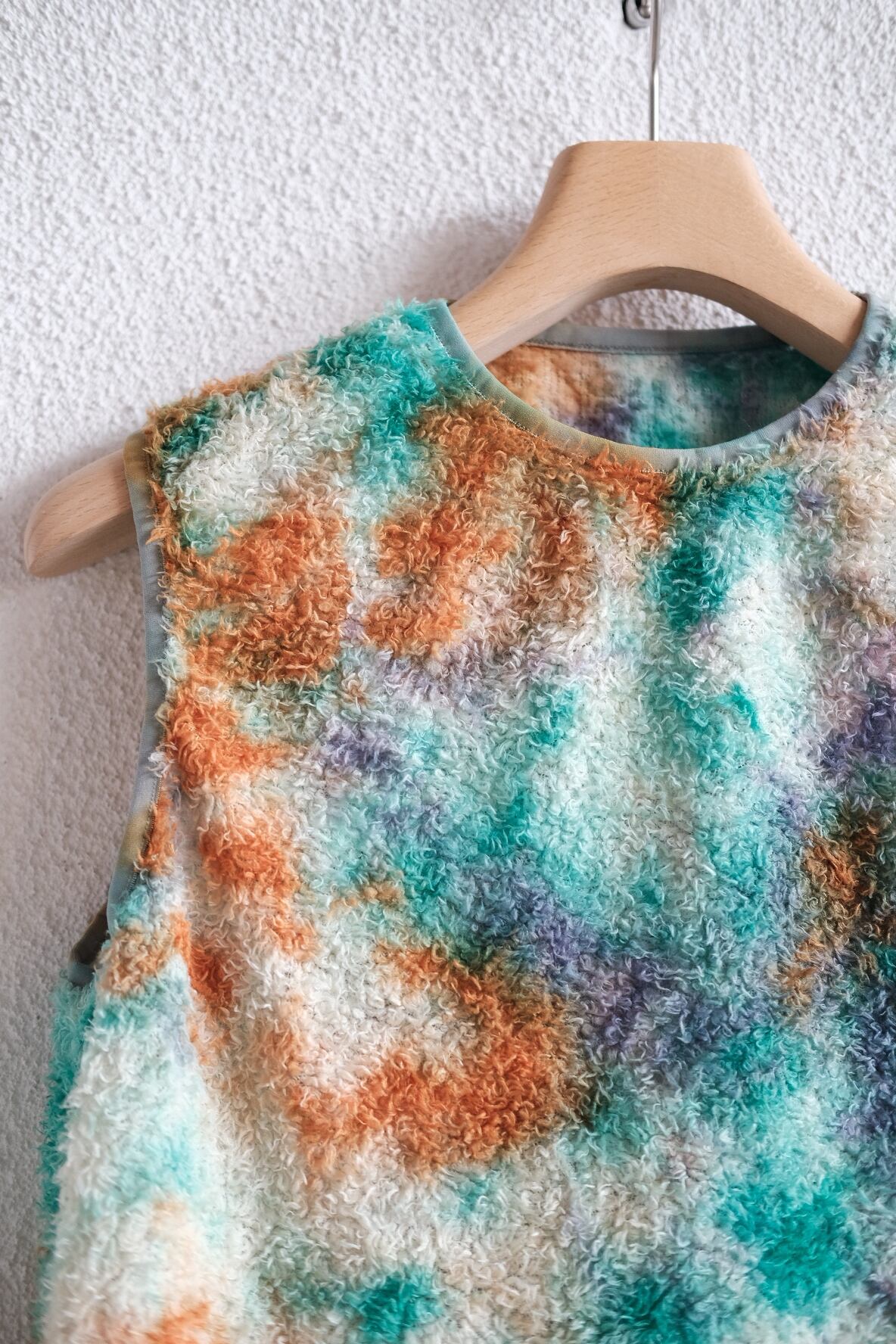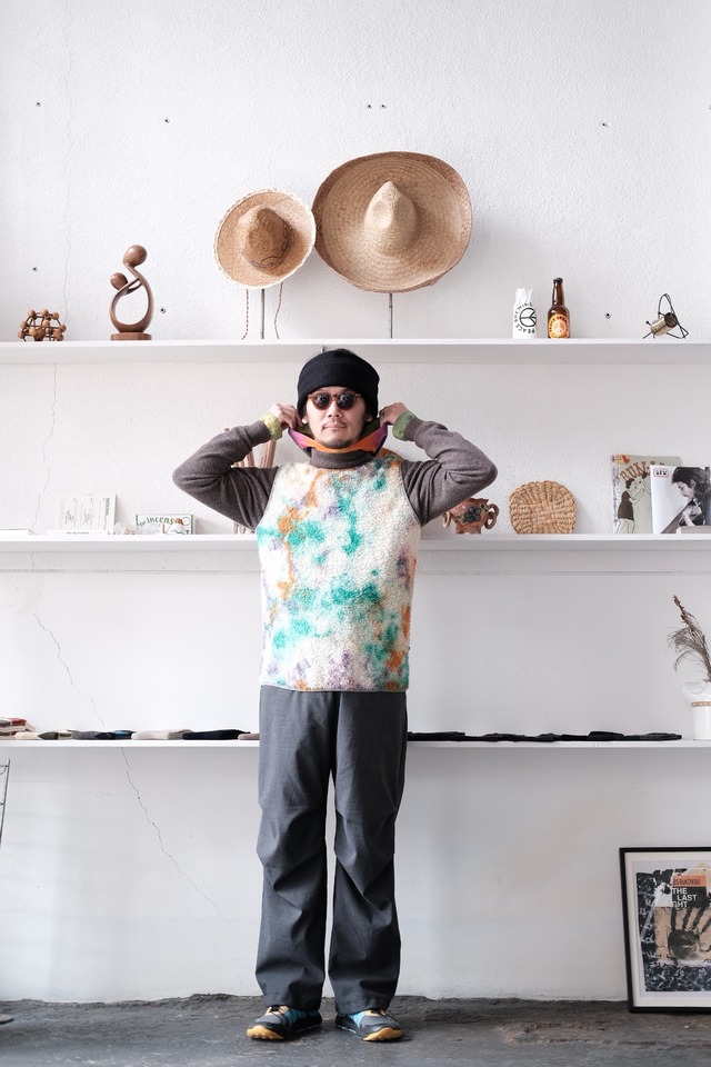 米国ポーラテック社が開発した"POLATEC ALPHA"。通気性とストレッチ性を両立するメッシュ生地をベースに、化繊綿を編みこむことで保温力を持たせたインサレーション素材。毛足のあるフリースのような見た目ですが、濡れても保水せずに速乾性にも優れています。リサイクルポリエステルを使った120g/m2厚のPOLATEC ALPHAをセレクトしました。縫製後に、4回の絞染でタイダイ風に仕上げました。