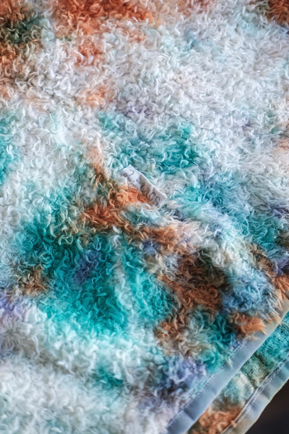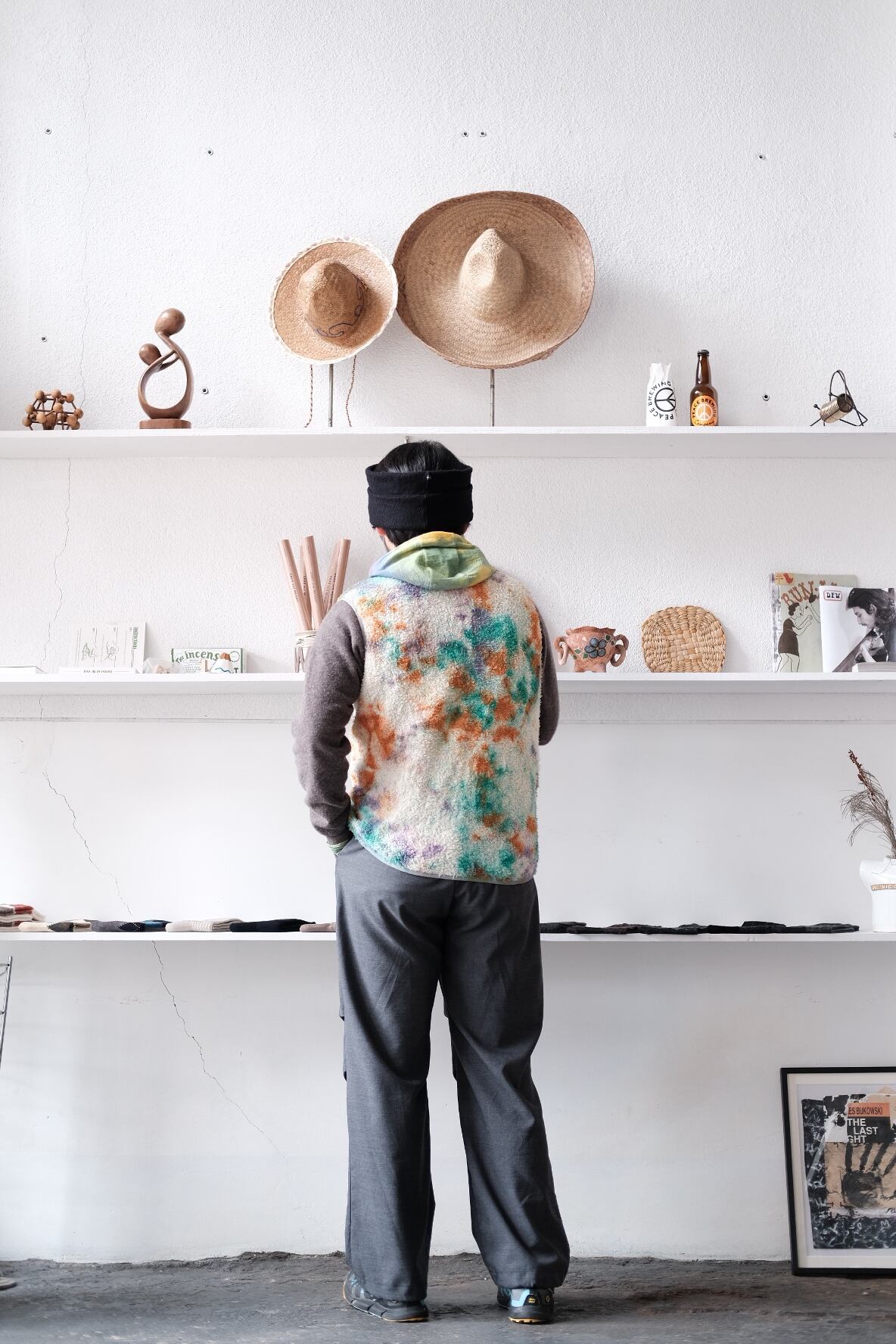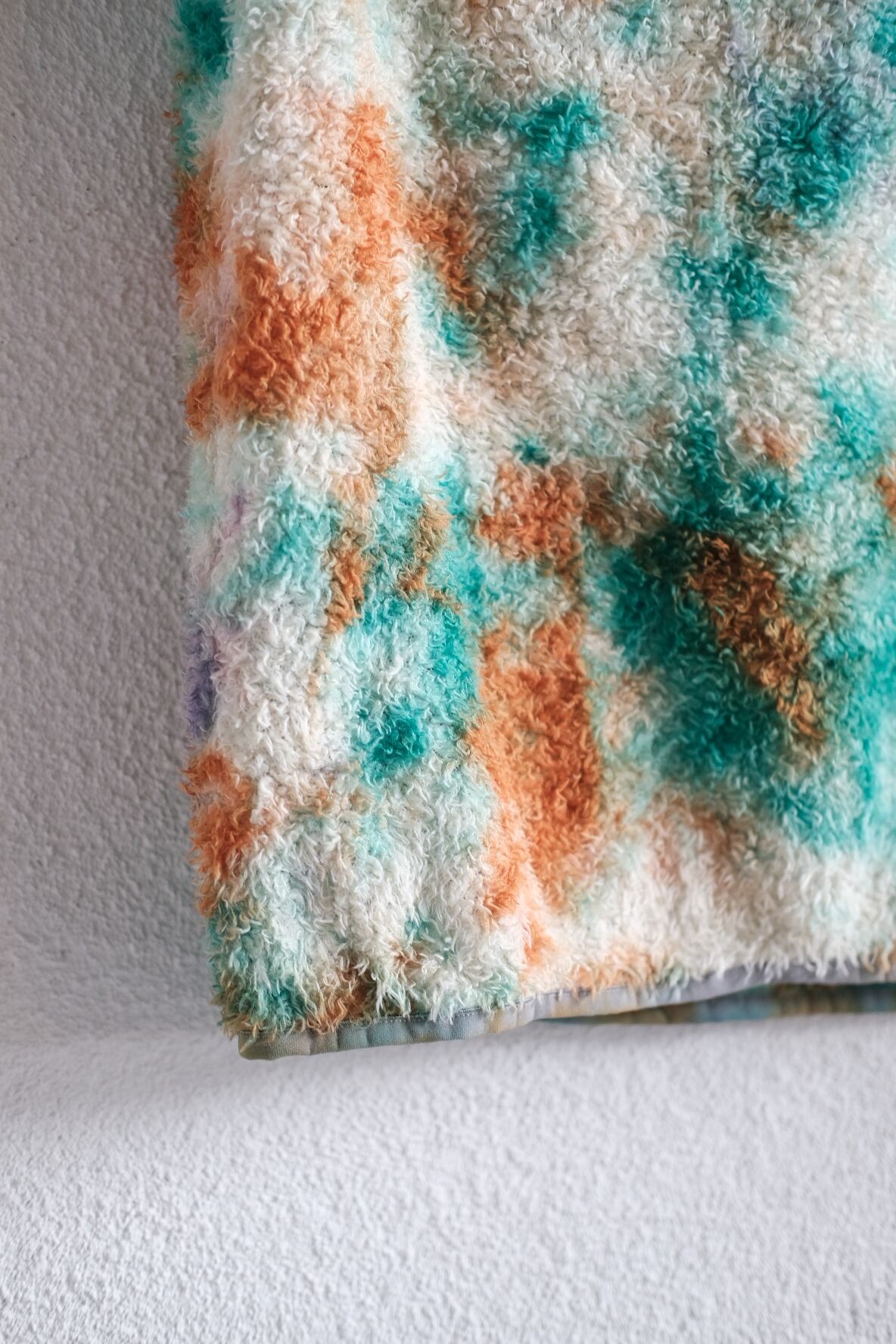 米国ポーラテック社が開発した"POLATEC ALPHA"。通気性とストレッチ性を両立するメッシュ生地をベースに、化繊綿を編みこむことで保温力を持たせたインサレーション素材。毛足のあるフリースのような見た目ですが、濡れても保水せずに速乾性にも優れています。リサイクルポリエステルを使った120g/m2厚のPOLATEC ALPHAをセレクトしました。縫製後に、4回の絞染でタイダイ風に仕上げました。