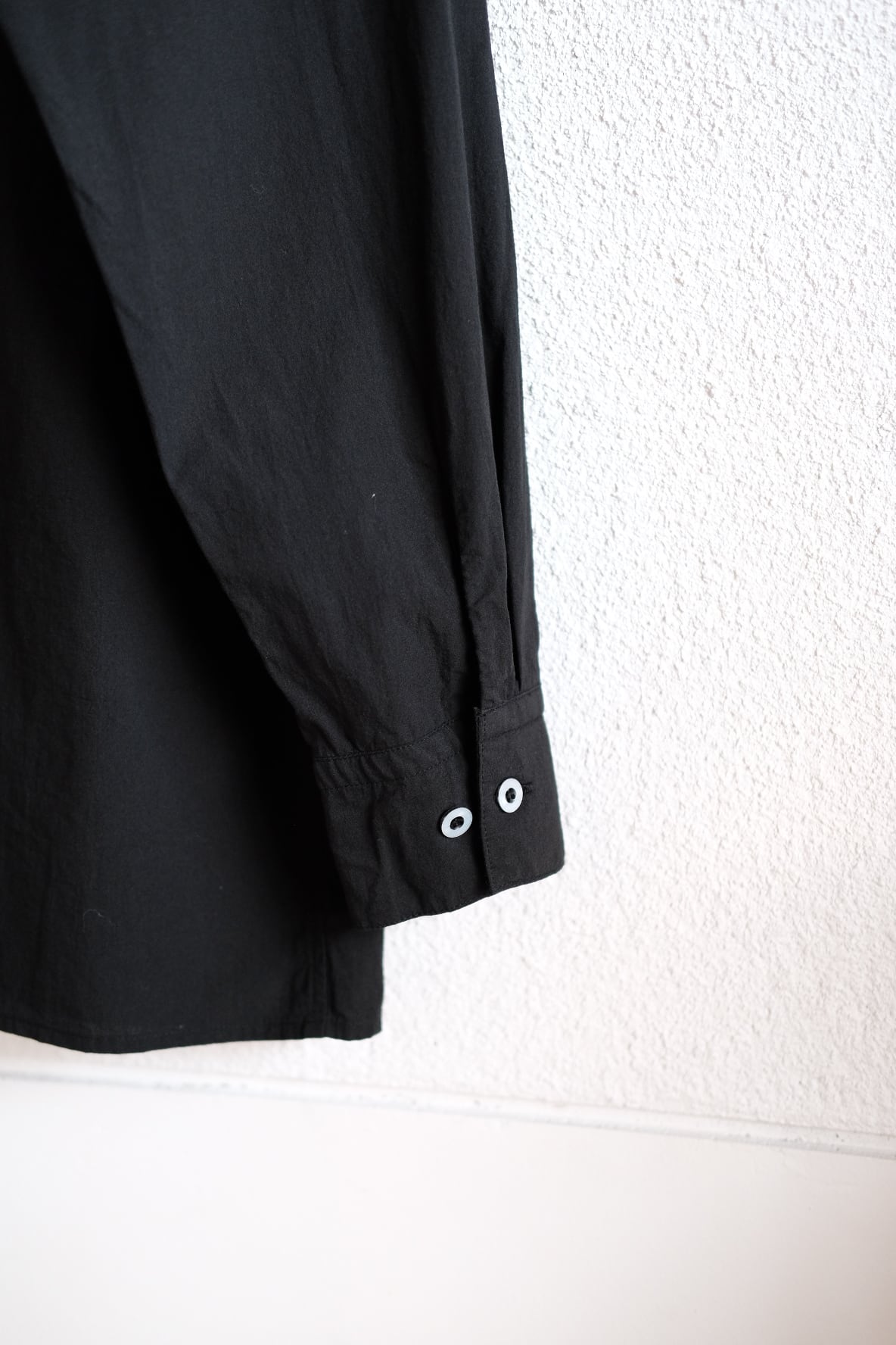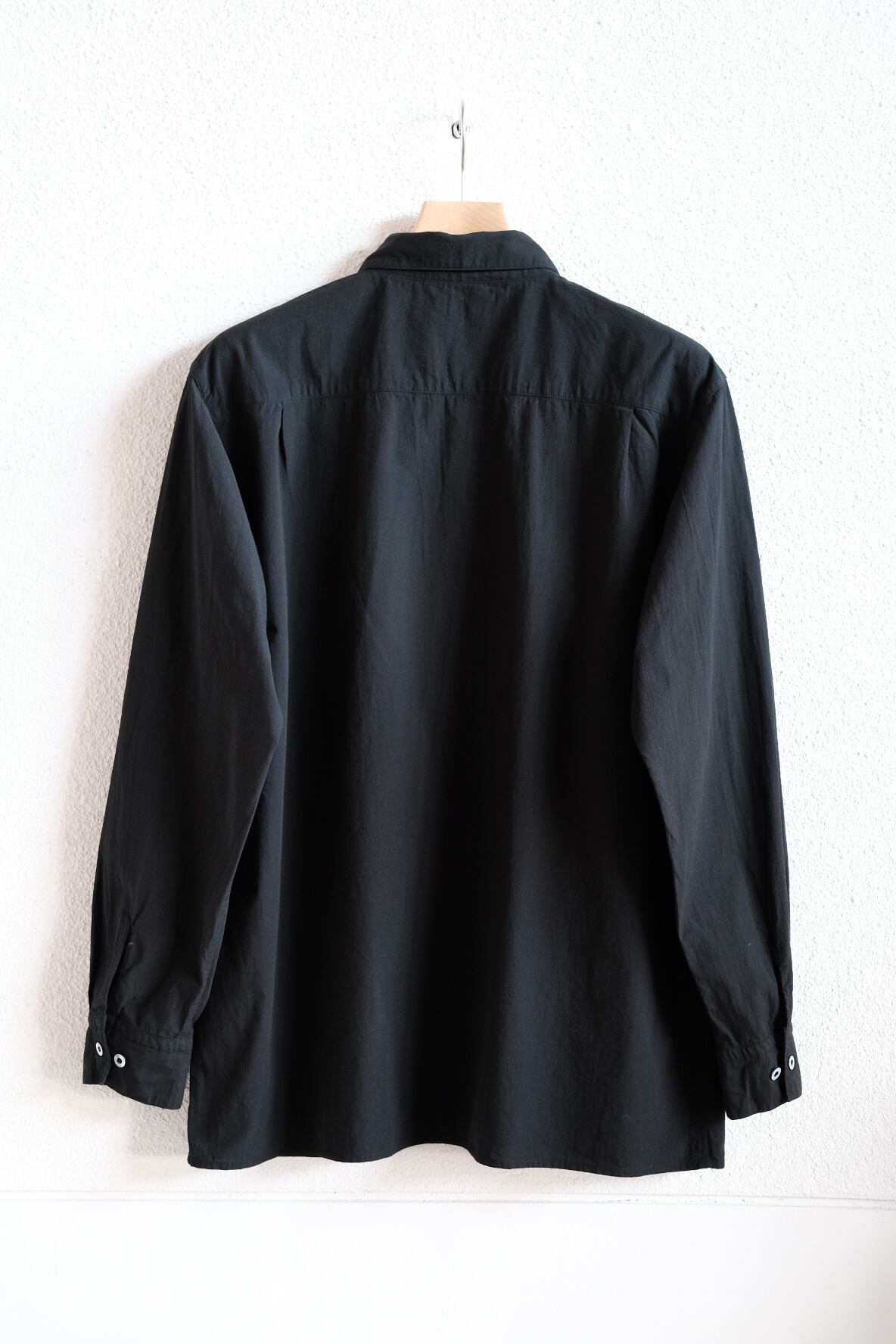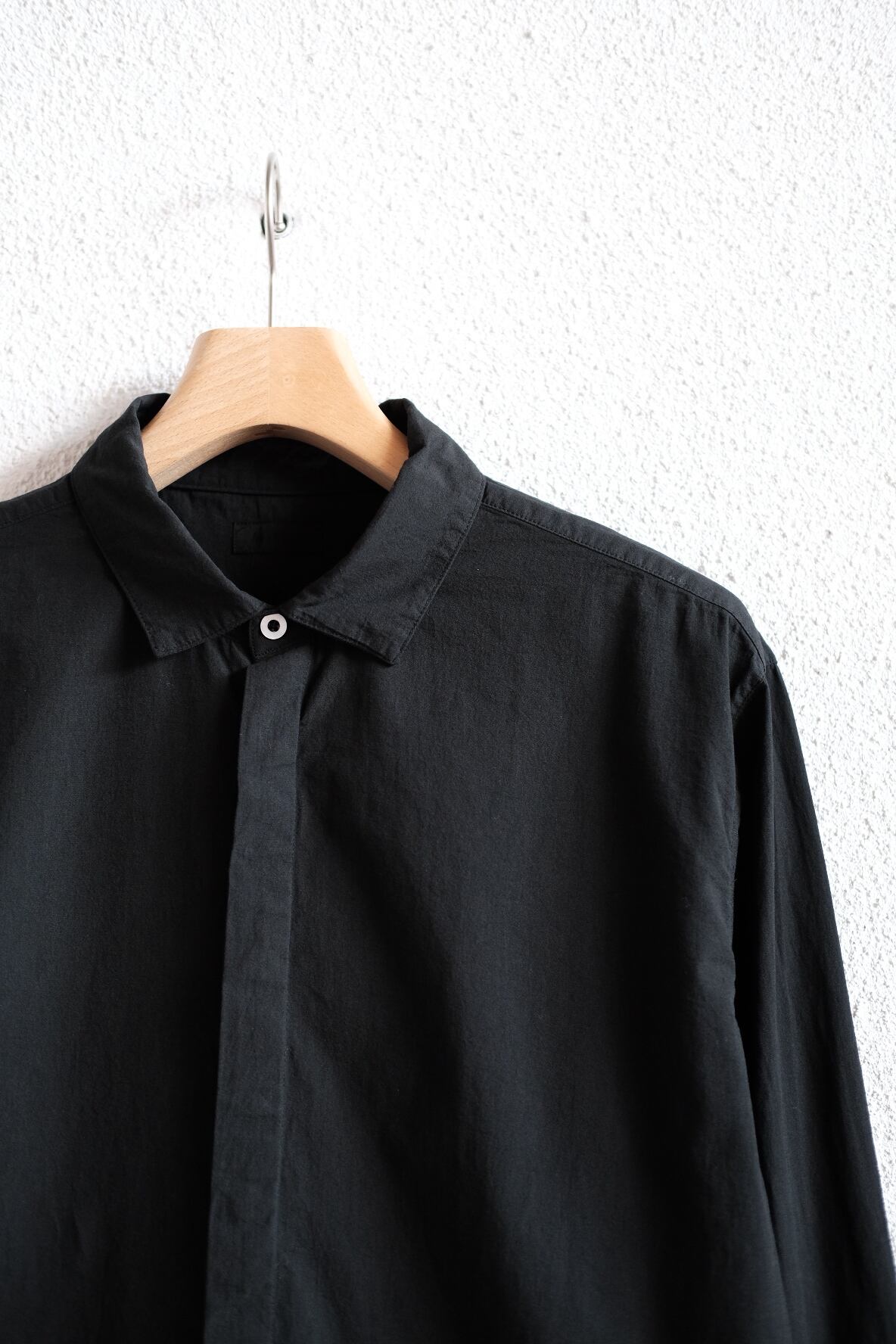 MITTANの中で新しいオーソドックスを目指したデザインのシャツです。程よいゆとりを持たせたシルエットで、強撚生地のストレッチ性と相まって快適に着用できます。無駄を削ぎ落とすことを意識し、前立ての比翼仕立てや袖口開きのシンプルな仕様を採用しています。表に見えるステッチは最小限に抑え、製品染めの表情が際立つよう設計しました。機能性に基づいたパターンにより、カジュアルからドレスシーンまで幅広く着用できます。ボタンには貝ボタンを使用しています。