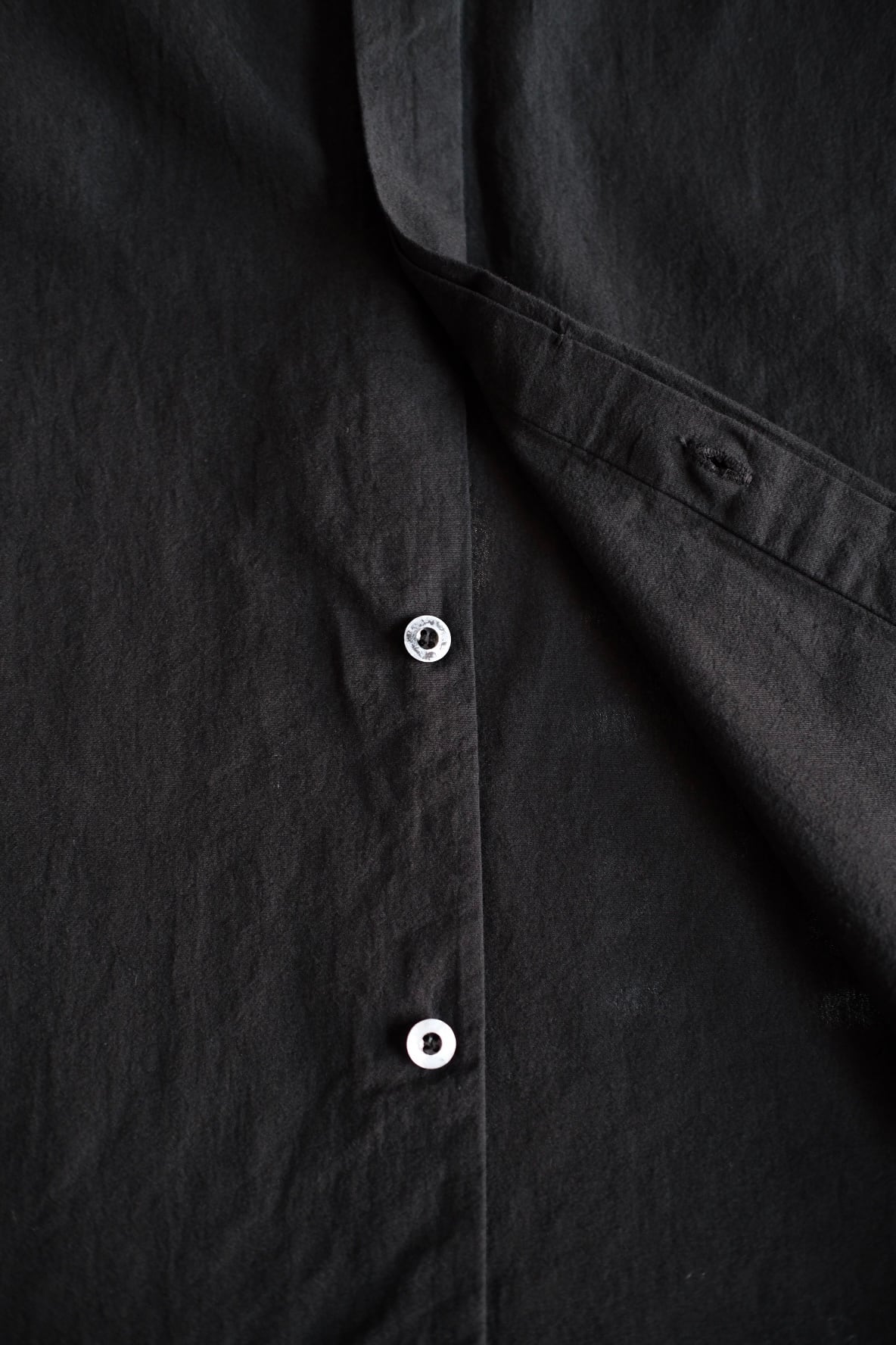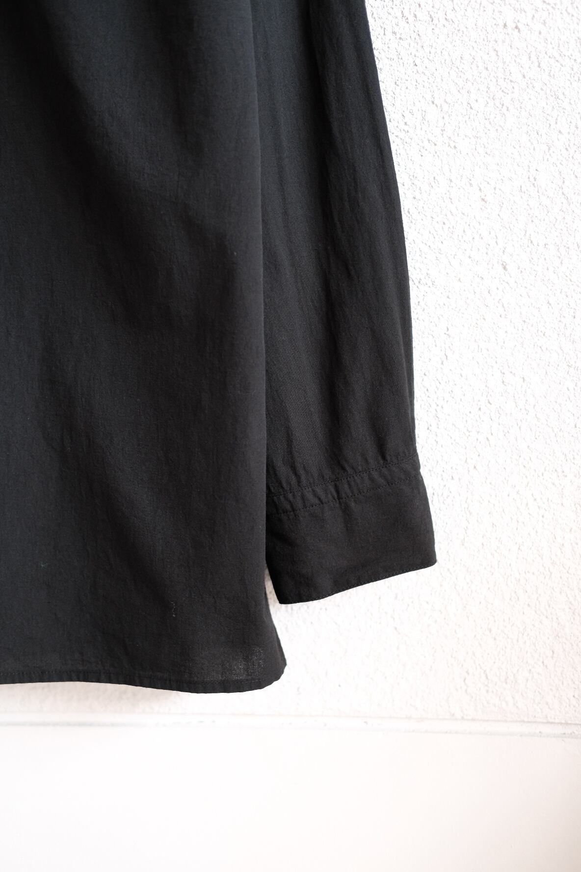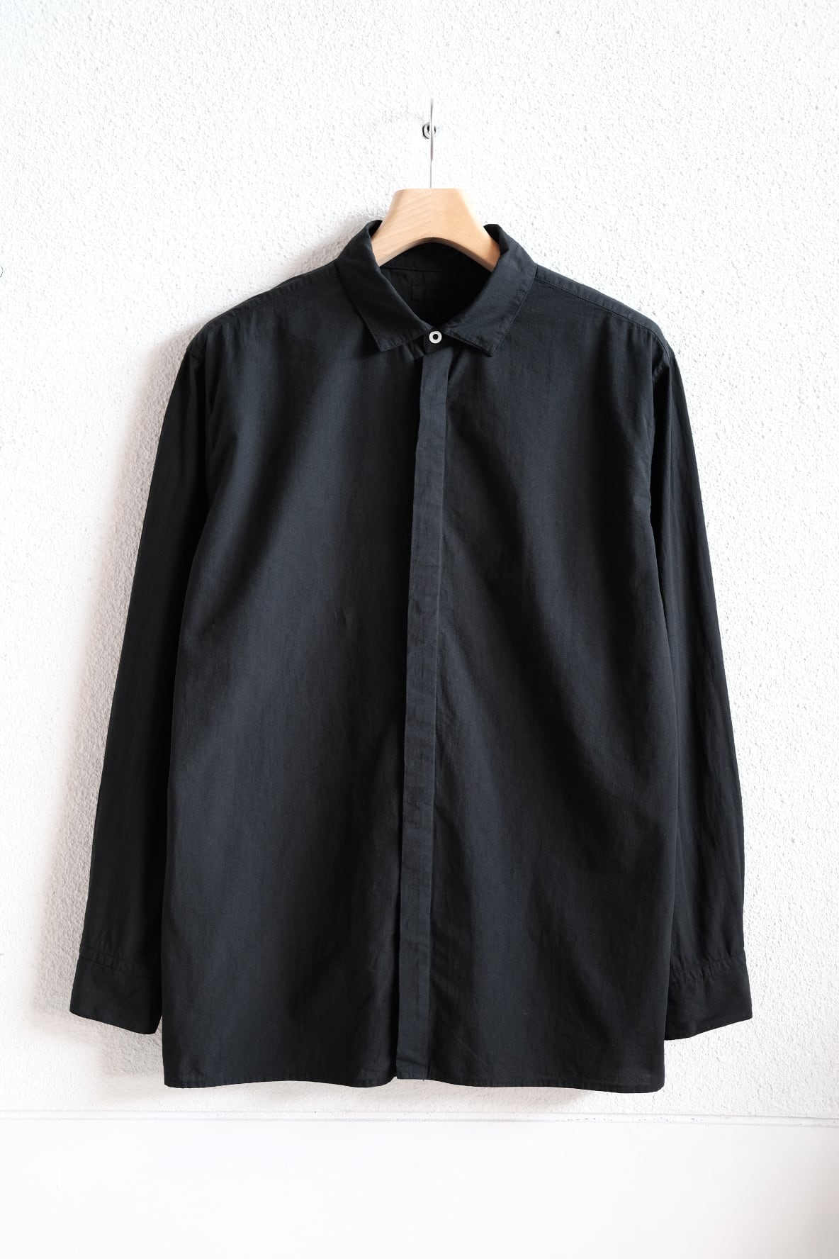 MITTANの中で新しいオーソドックスを目指したデザインのシャツです。程よいゆとりを持たせたシルエットで、強撚生地のストレッチ性と相まって快適に着用できます。無駄を削ぎ落とすことを意識し、前立ての比翼仕立てや袖口開きのシンプルな仕様を採用しています。表に見えるステッチは最小限に抑え、製品染めの表情が際立つよう設計しました。機能性に基づいたパターンにより、カジュアルからドレスシーンまで幅広く着用できます。ボタンには貝ボタンを使用しています。