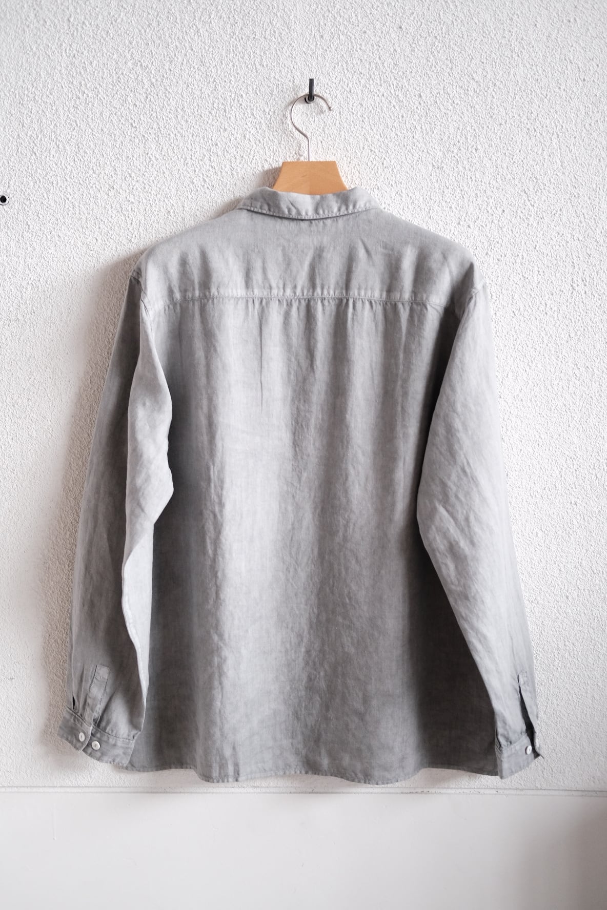 シャツは現代の民族服を構成する洋服としての提案になります。構成は洋服のルールに則りながら、極力デザインを削ぎ落とし、機能性に基づいたパターンメイクとしています。具体的には袖山をいせ込み、袖底を高めに設定することで腕周りの運動量を、背中のヨークにタックやギャザーではなく、いせを入れることで背中の運動量を確保しています。新しい定番となるベーシックなシルエットです。ボタンには淡水貝のボタンを使用しています。