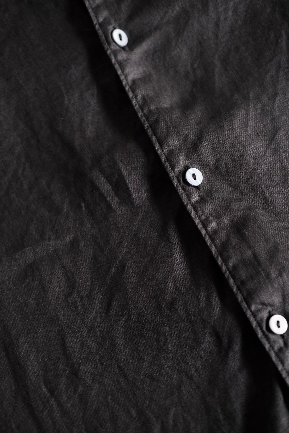 シャツは現代の民族服を構成する洋服としての提案になります。構成は洋服のルールに則りながら、極力デザインを削ぎ落とし、機能性に基づいたパターンメイクとしています。具体的には袖山をいせ込み、袖底を高めに設定することで腕周りの運動量を、背中のヨークにタックやギャザーではなく、いせを入れることで背中の運動量を確保しています。新しい定番となるベーシックなシルエットです。ボタンには淡水貝のボタンを使用しています。