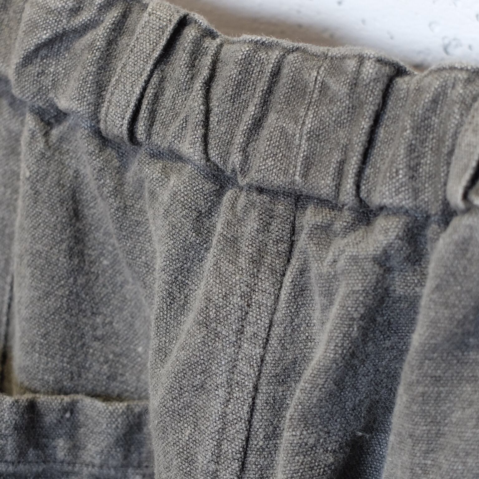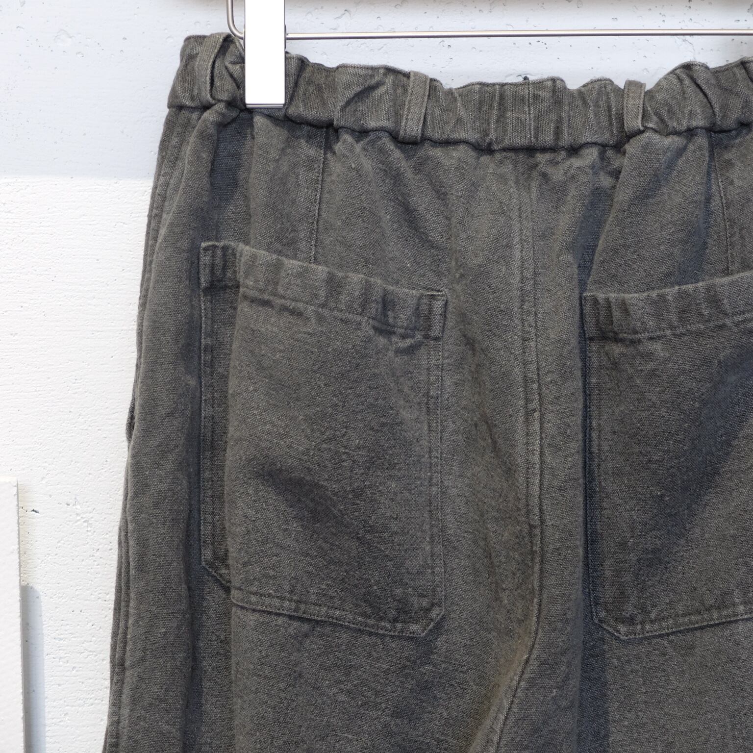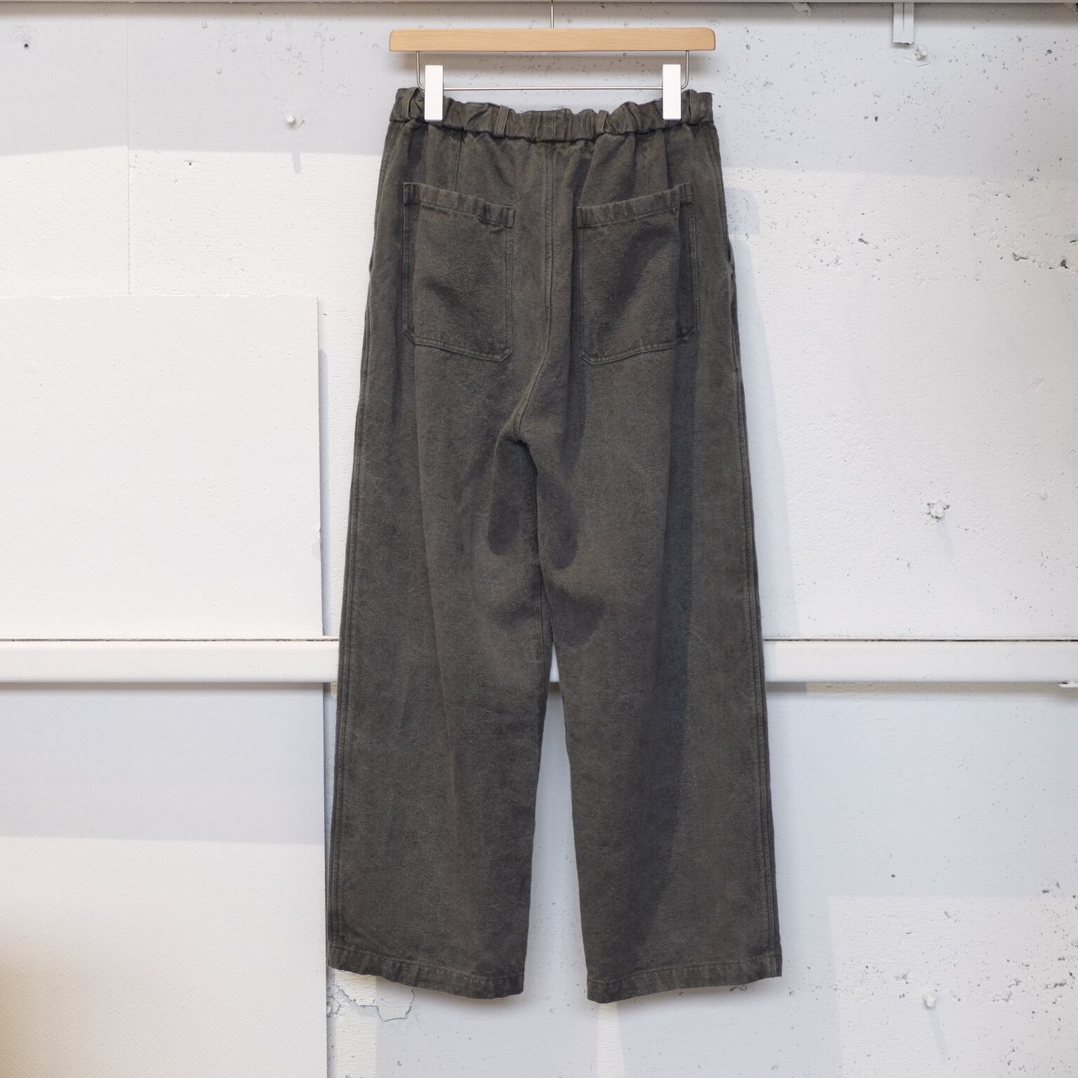 ミッタンを選ぶならまずはこれ。数あるミッタン製品の中でご愛用者が一番多いアイテムになります。何にでも合わせやすく・年中使えて・飽きも来ない・本当に永く愛用でき、間違いなくクローゼットのベテラン選手になる1着です。洗濯を繰り返し古い布のようになっていく生地は愛着が生まれ、傷みがあればリペアを施し、色が抜ければ染め直しを施すことで、着用される方それぞれの”アジ”が必ず出てきます。麻100%ですが、生地厚を例えるなら柔らかいキャンバス地のような感じ。ペラペラの薄手ではありませんので冬場でも着用いただけます。(逆に真夏は少し暑く感じるかもしれません)柔らかく少し重みのある生地なので、着用時に動きとドレープがあり、良い雰囲気を出してくれるんです。ワイドとはいえ、めちゃくちゃ太くはありません。ストンと落ちるストレートシルエット。モードとクラシック、どちらも楽しめると思います。