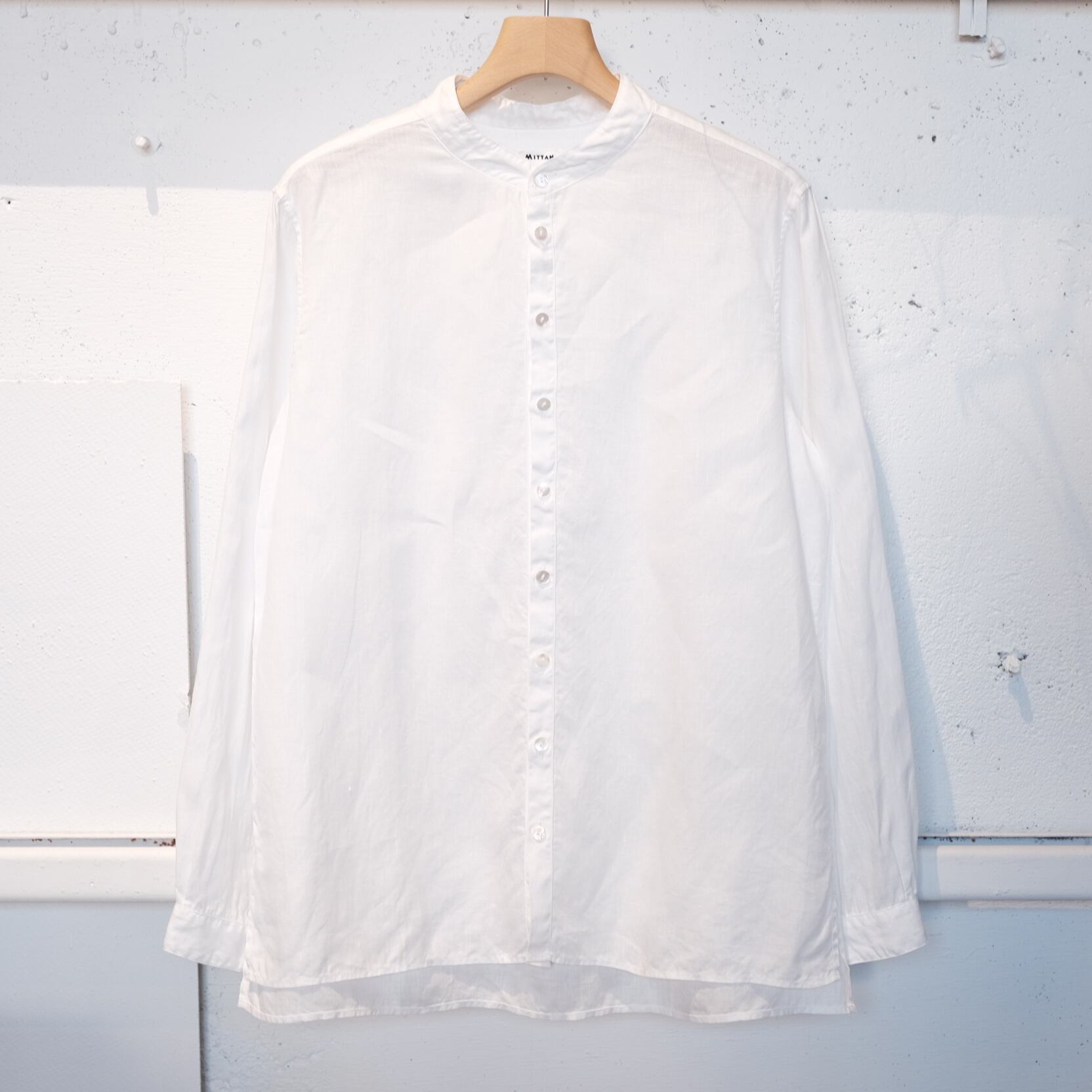 オーセンティックなスタンドカラーシャツですが、ミッタンらしい雰囲気のある仕上がり。パッと見て分かりやすいのはボタンの数が少し多くこちらもポイントです。光沢のある生地はジーンズやミリタリーパンツなどとも相性がいいでしょう。