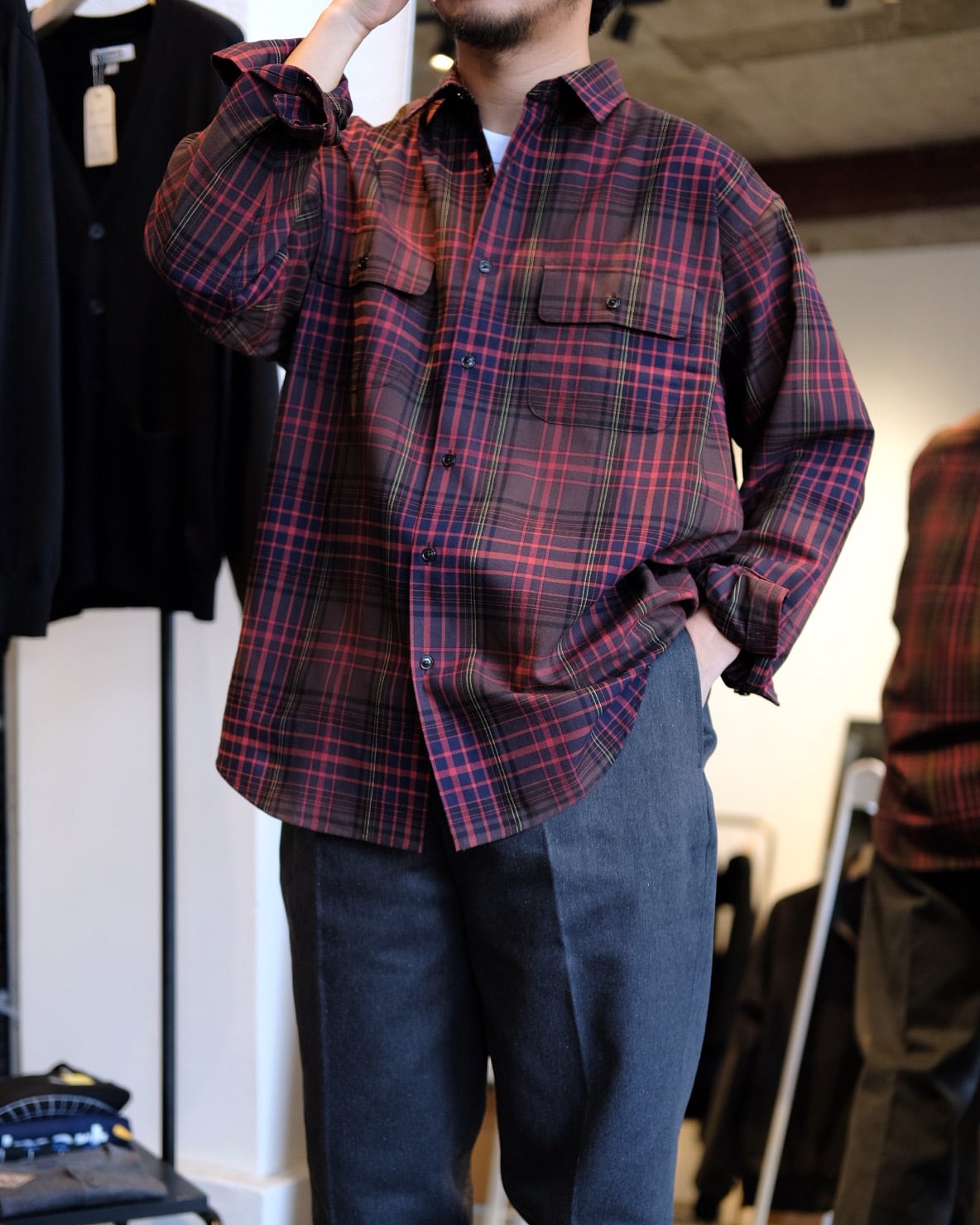 毎度ですがダブルフラップポケットのレギュラーカラーです!新しいシーズンが始まるごとに気に入ってくれる方が少しずつ増えて本当に嬉しいです。今年は春夏シーズンでも使われるメリノウールナイロンをオックスフォード生地にて。いや〜今回も本当に良い仕上がりです。ウールのオックスということでコットン地よりも綺麗な仕上がりで、さらに今回もドレスシャツ工場の縫製。前立てを付けず綺麗な柄合わせをすることにより、ヘビーな印象のチェックシャツですがとても良い塩梅です。ぜひスラックスからジーンズまで幅広いボトムとスタイリングしていただきたいです。それともう一つお伝えしたいのは配色です。赤が強く見えがちですが、他の色が程よく柔らかくしてくれて奥行きのあるとてもいいバランスです。こってりし過ぎない良いバランス。写真では伝わりにくいかもしれませんが本当に良い配色ですよ。今シーズンもぜひ。
