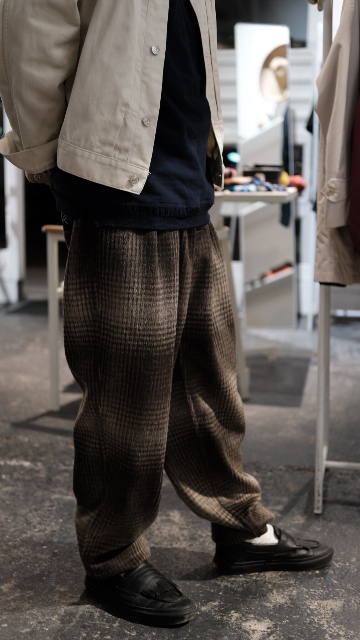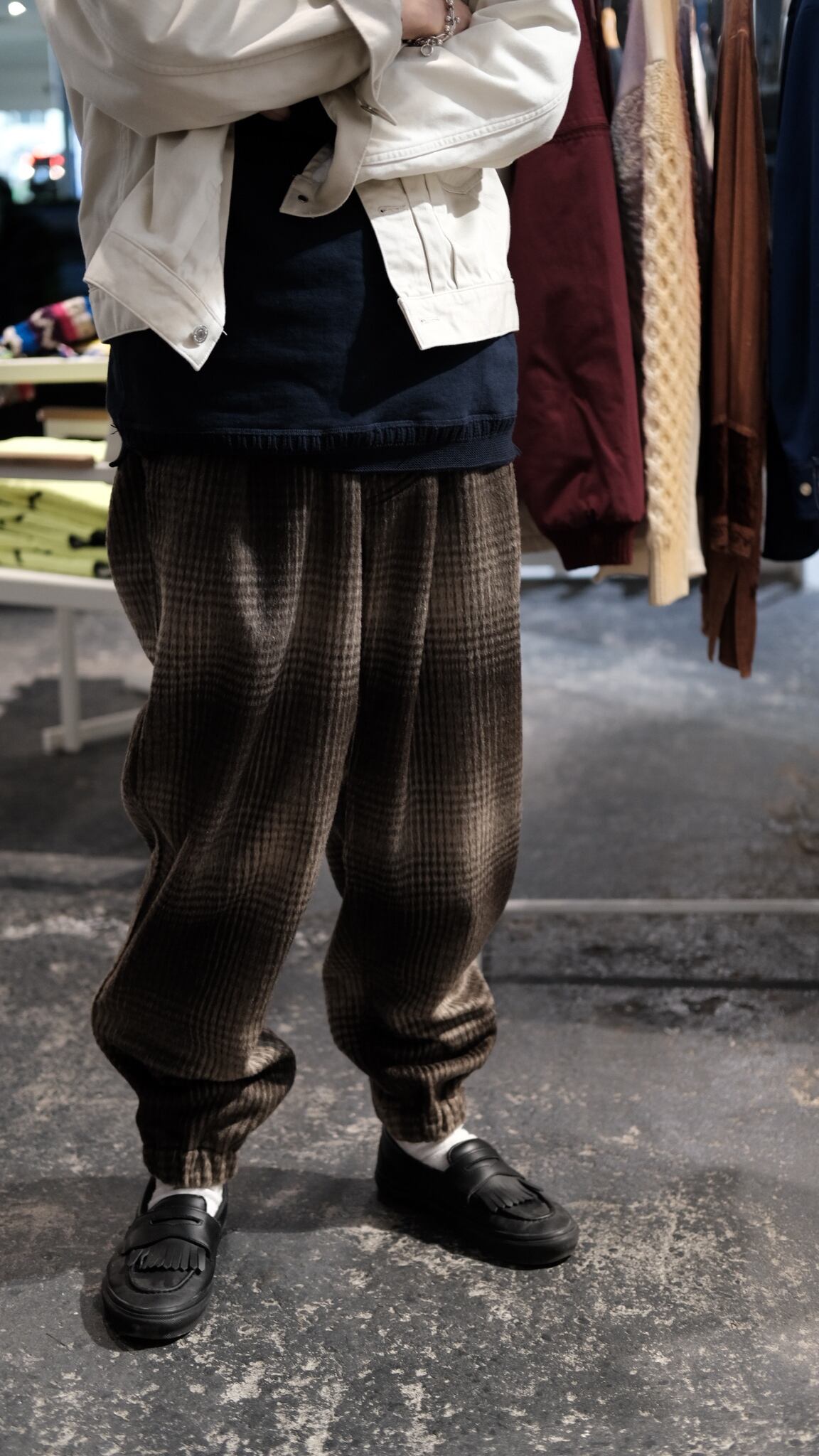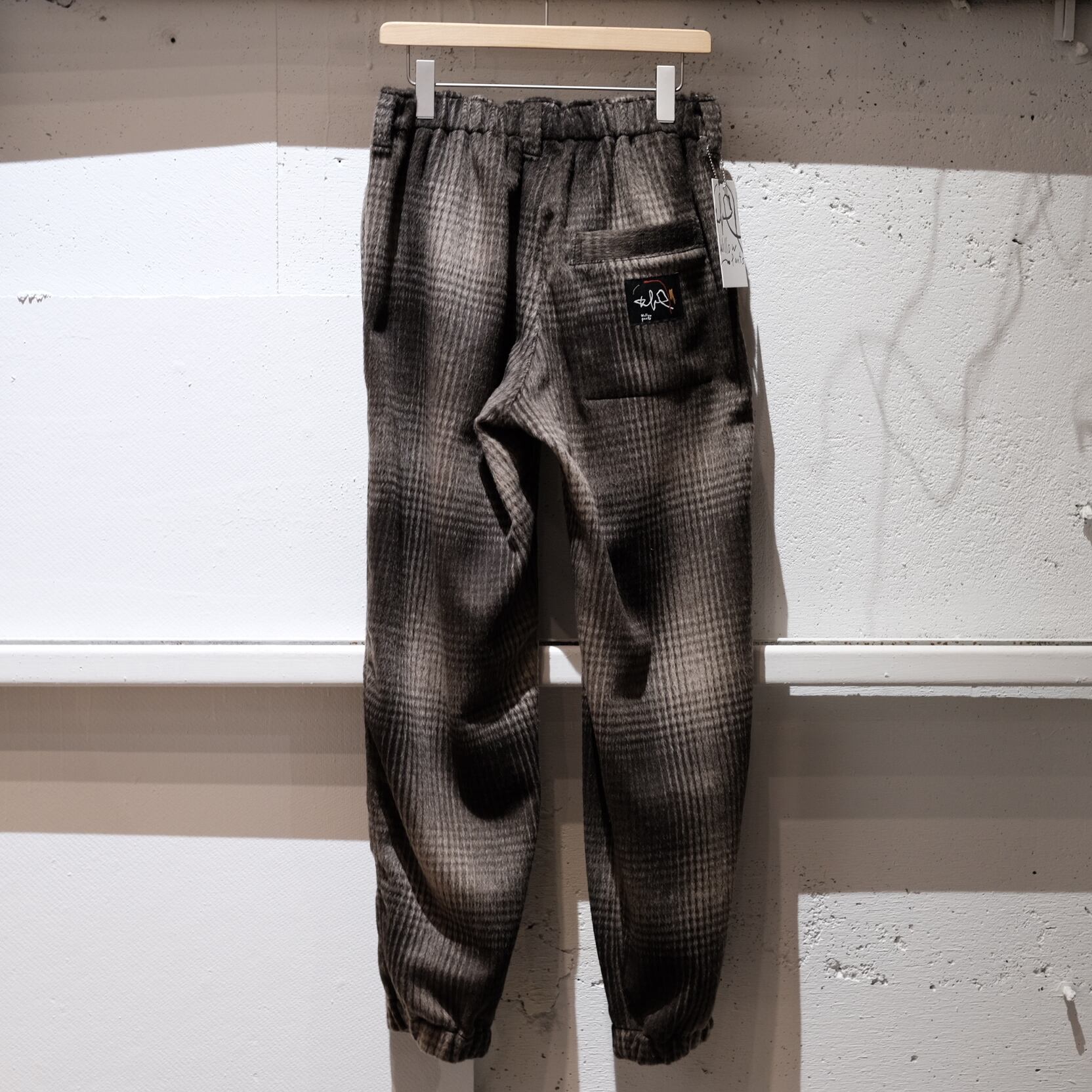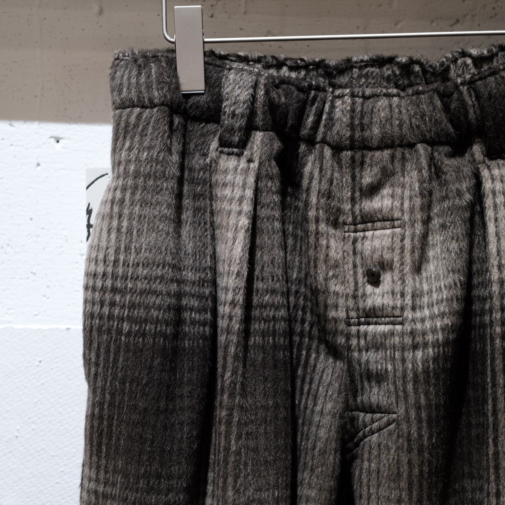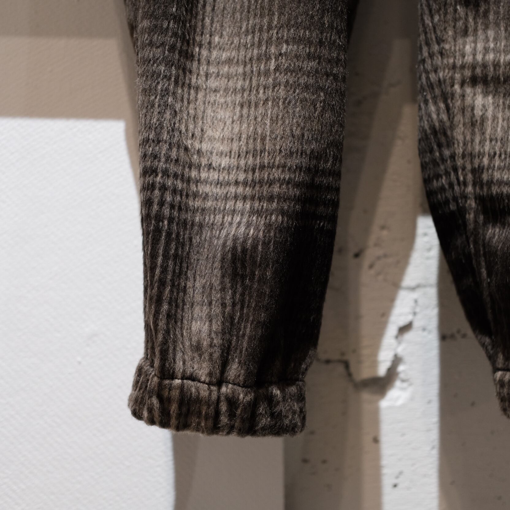 ラストデリバリーに相応しいパンツが入荷しました。「限定20本生産」と希少なモデルになります。展示会に伺った際デザイナーのパンサーさんも着用されていてめちゃくちゃかっこよくて、、、思わずその場でオーダーをお願いしちゃいました。型としては当店では初めての展開となるP-014。ツータック入ったゆとりのある腰回りから緩やかなテーパードシルエット。裾にゴムが入ってますのでちょいと癖があって良い感じのパンツなんです。生地はウールポリのふわふわシャギー。全然チクチクしませんのでご安心を。滑らかな肌あたりで気持ちがいいです。ご家庭でのお洗濯もOKです。懐かしさを感じるオンブレーチェックは、クールなスタイリングからゴリゴリ古着に合わせてもかっこ良さそうです。裾の絞りは、中に入れ込んじゃってスッキリさせるのもおすすめですよ。様々なスタイリングでお楽しみください。