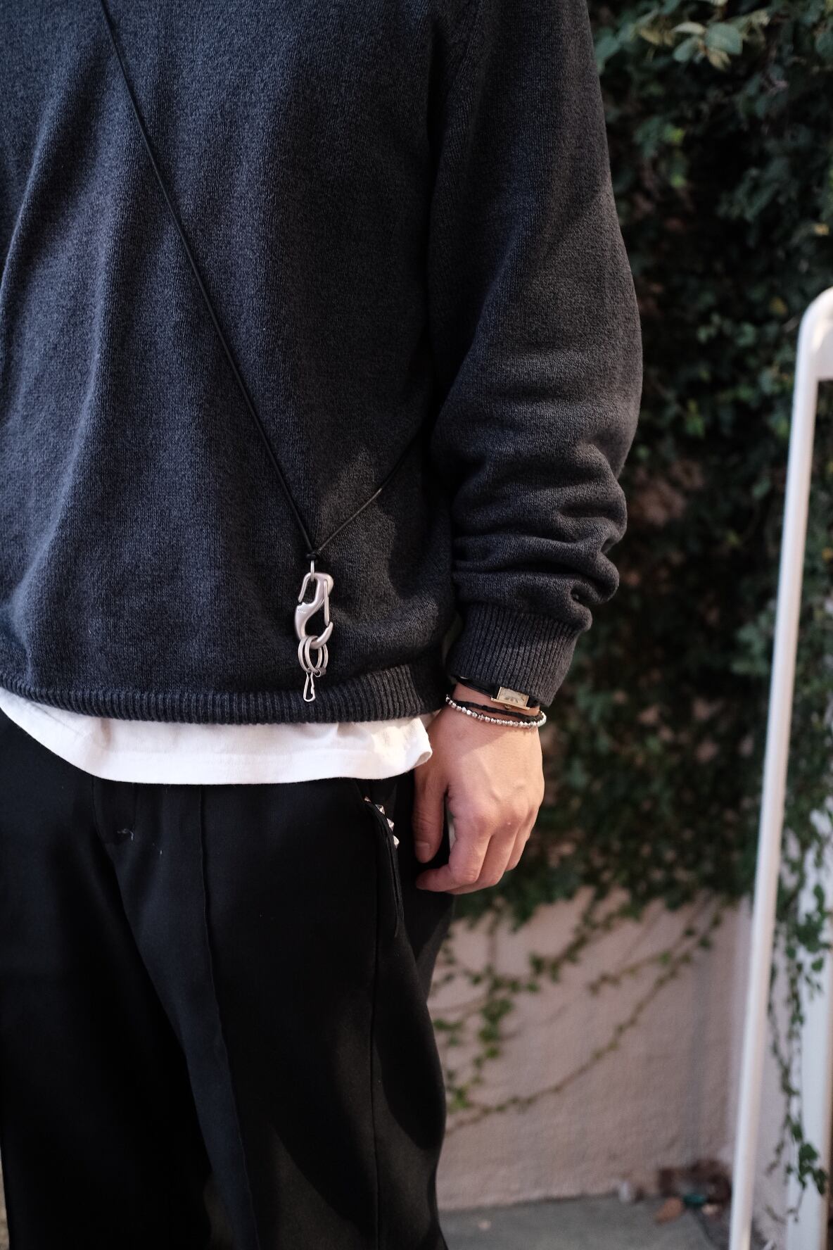 フランスのマリンメーカー<ウィチャード社>が作るフックを使用したキーホルダー。真鍮にシルバーコーティングを施しています。首からでも肩から斜めがけもできる長さになっております。ややマットな色合いも良い感じです。レザーコードのステッチにもご注目ください。
