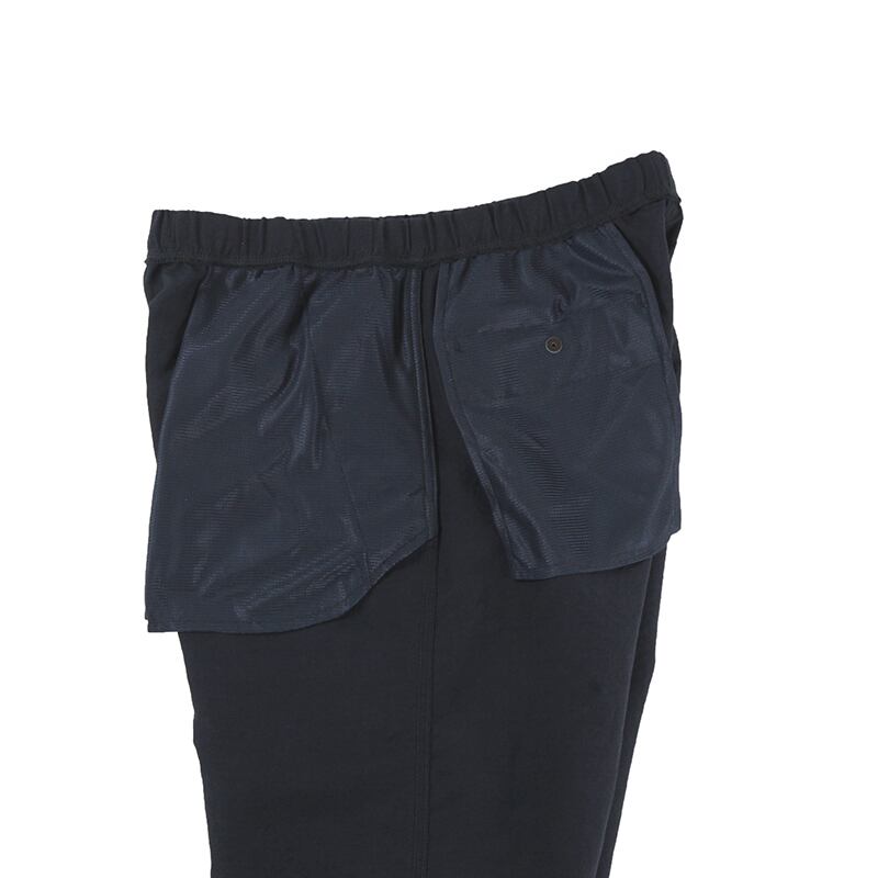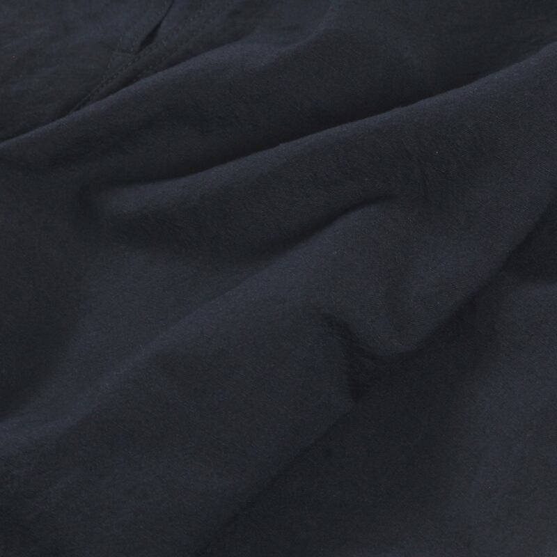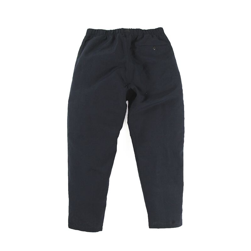 "Wool linen weather"を採用した"Easy pants"。たっぷりとしたヒップとワタリから緩くテーパードしたシルエット。深めにとった股上に、ゴムとアジャスターベルトをつけたウエストと非常に楽チンな履き心地です。フロントには左右にスラッシュポケット、バックには右にドットボタン付きの玉縁ポケットをそれぞれ配しています。股下にはクライミングパンツを参考にしたガゼットを採用。ポケットスレキにはクールマックスメッシュを。