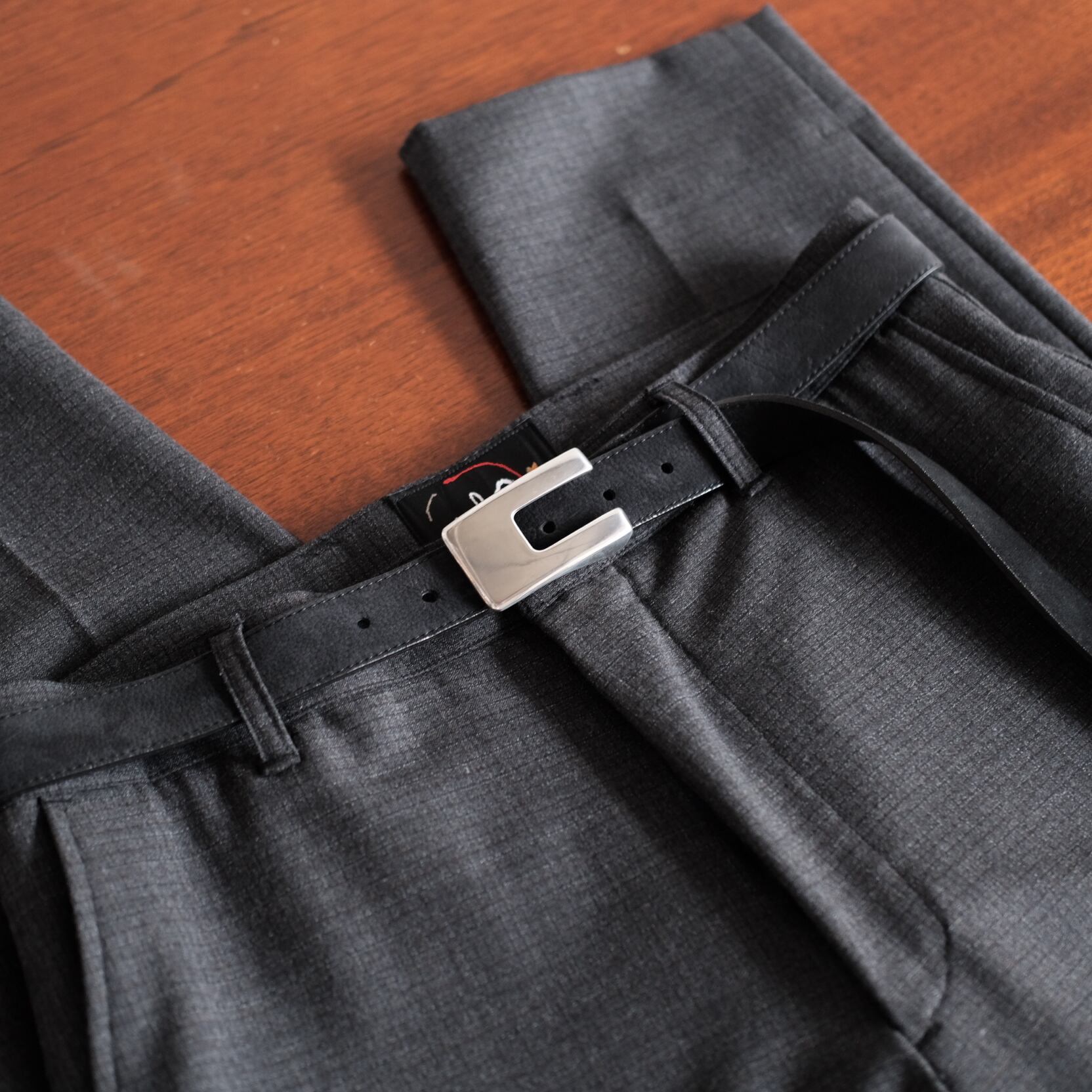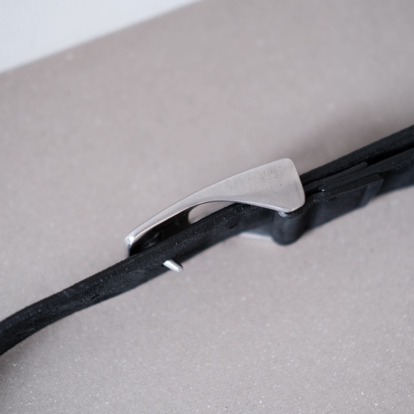 未使用の状態で発見されたデッドストックのバックルを使用しております。ピューター特有の味のある雰囲気で珍しい型のバックルです。