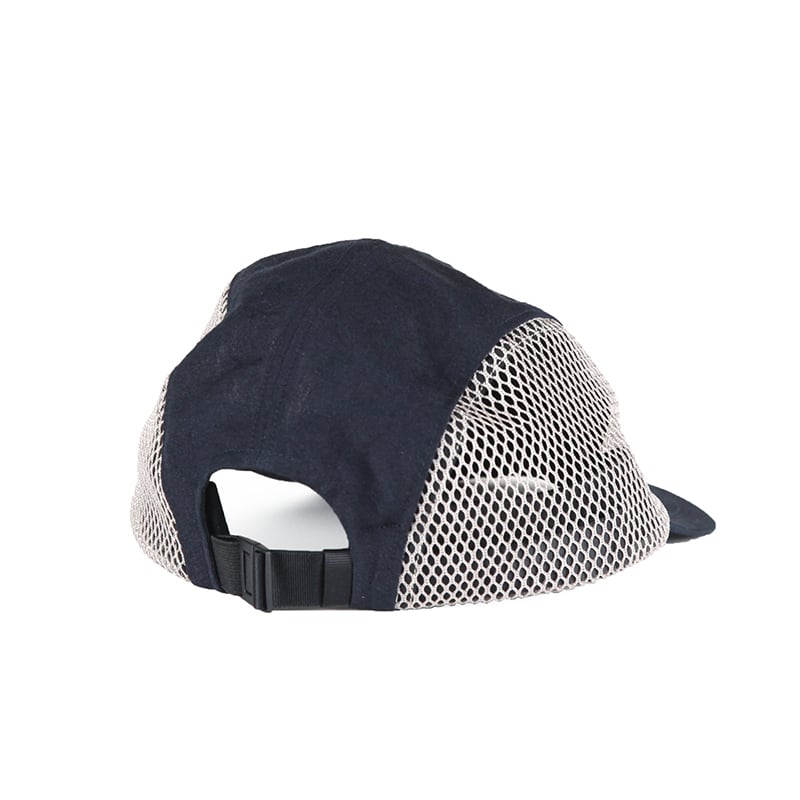 "Wool linen weather"とメッシュ切り替えた"Mesh jet cap"。日差しを防ぎながら、風抜けが良い被り心地です。スベリには厚手のメッシュ生地を採用し、フィット感を高めています。ストラップで調整する"One Size Fit All"での展開です。