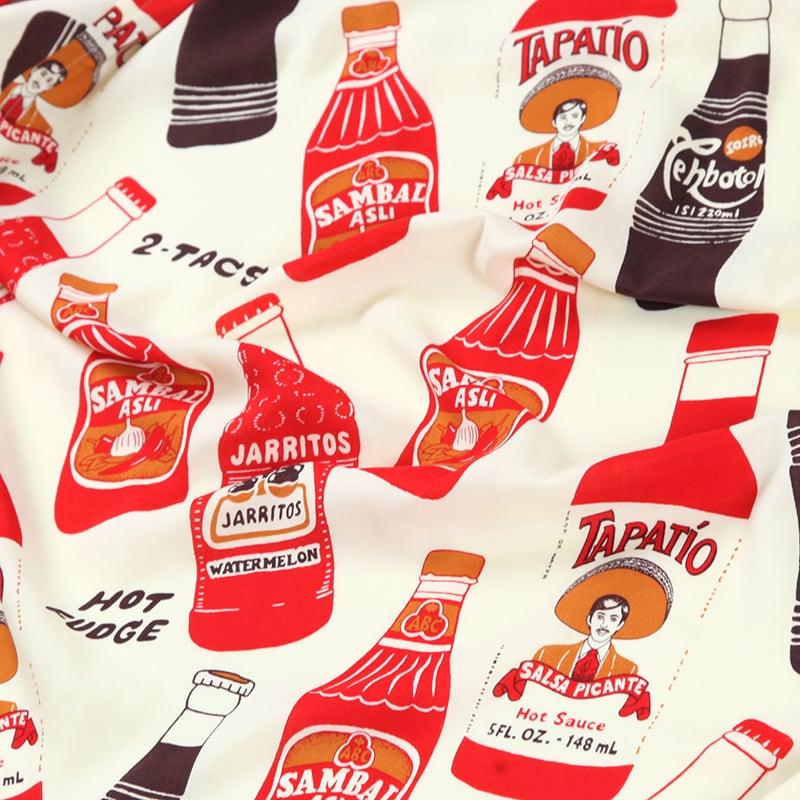 経緯共にレーヨンのスパン糸を使用し、非常に柔らかでトロミのあるアロハ生地。シルクスクリーンユニット"HOT FUDGE"のアーカイブからボトルをモチーフにした作品を4点を使用したオリジナルアロハ柄。4色使いのシルクスクリーンは、国内の熟練の職人による手作業によるもの。