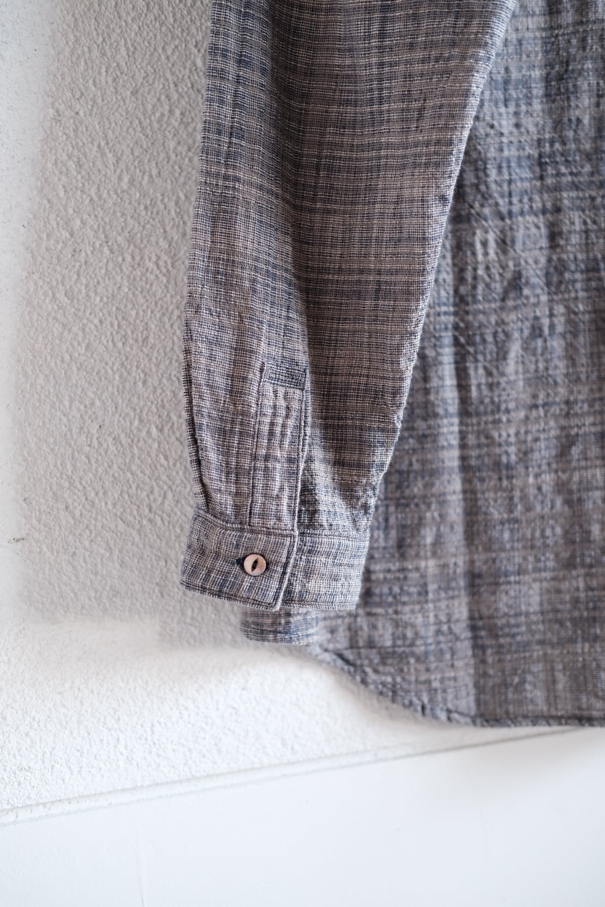 シャツは現代の民族服を構成する洋服としての提案になります。構成は洋服のルールに則りながら、極力デザインを削ぎ落とし、機能性に基づいたパターンメイクとしています。具体的には袖山をいせ込み、袖底を高めに設定することで腕周りの運動量を、背中のヨークにタックやギャザーではなく、いせを入れることで背中の運動量を確保しています。オーバーサイズでゆったりとしたシルエットです。ボタンは貝ボタンを使用しています。