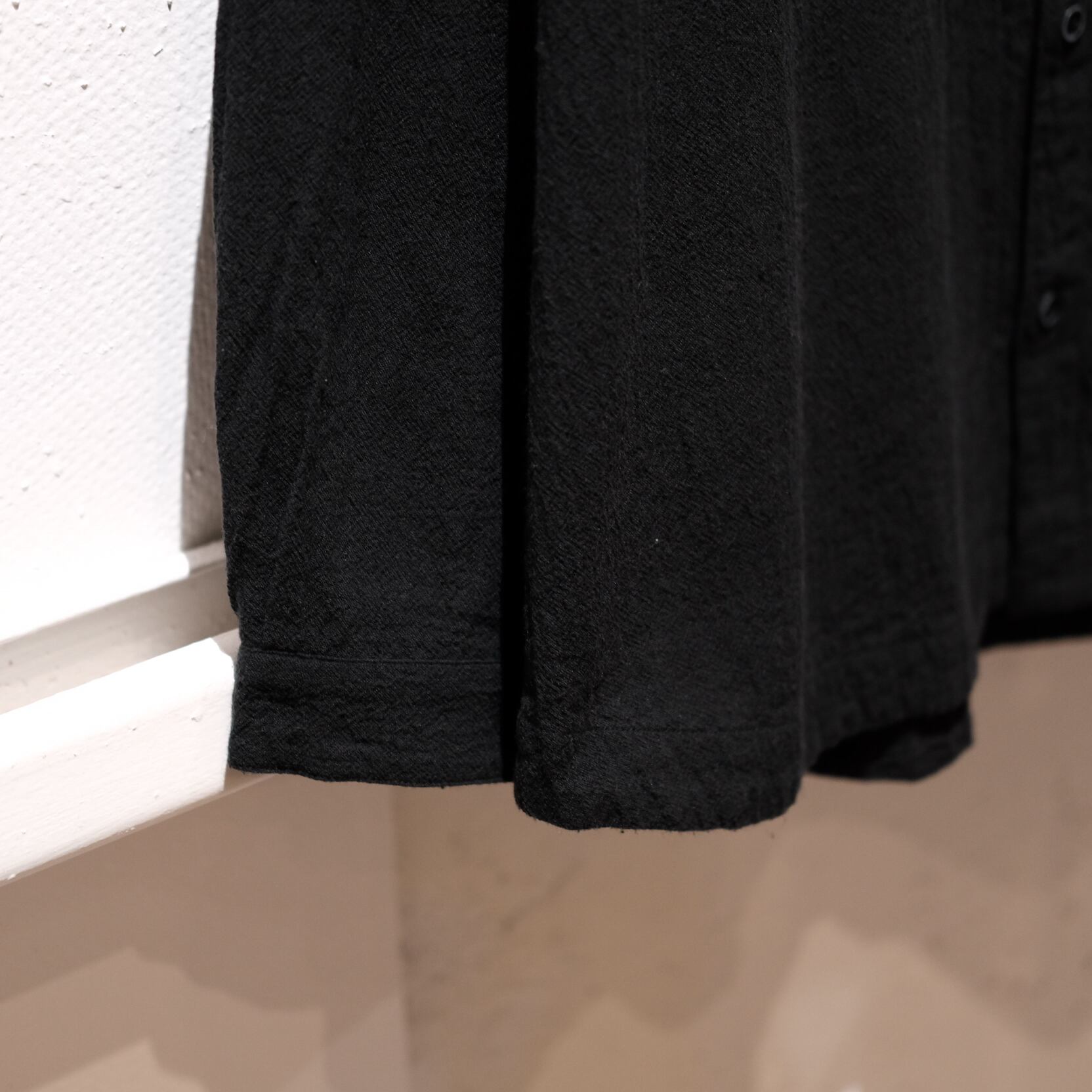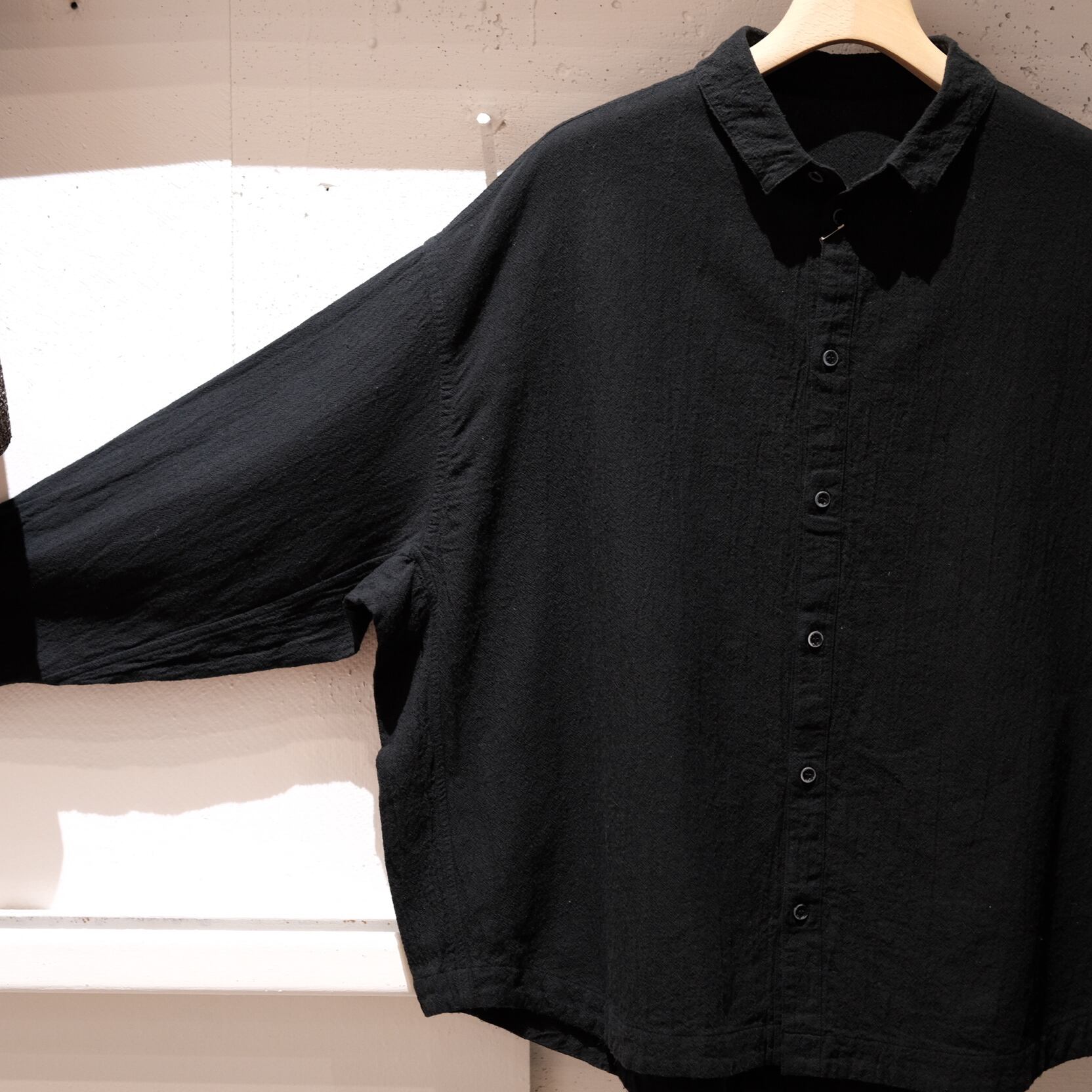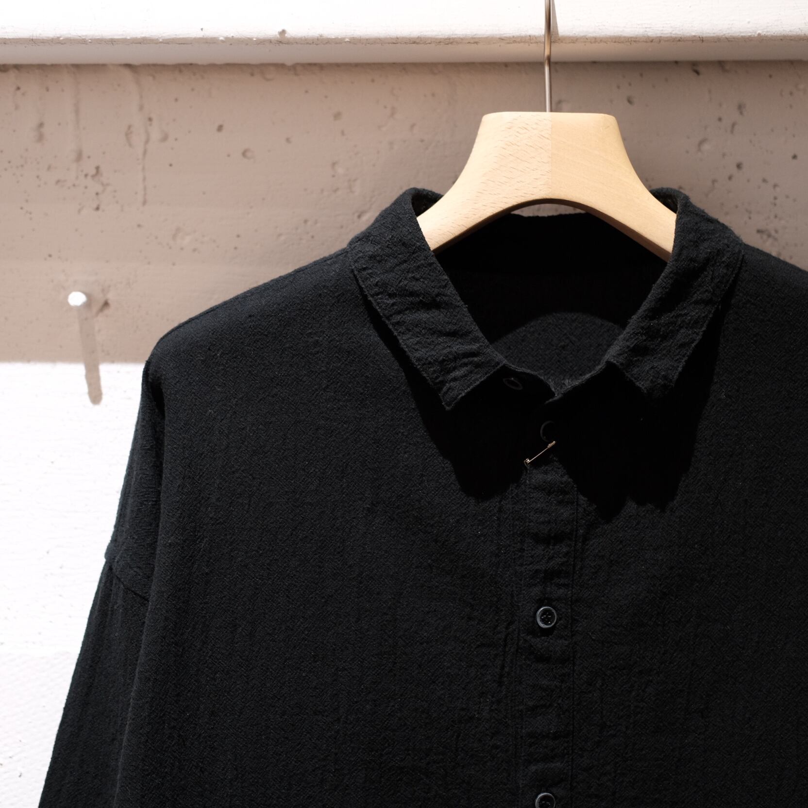 身幅に大きくゆとりを持たせたワイドシルエットのシャツです。たっぷりとした生地量ですが、柔らかな素材を使用しているため、自然な波打ちや落ち感が感じられます。平面的なシルエットながら、袖口から裾にかけてマチを入れることで、身体の厚みをカバーしつつ、運動量を確保しています。裾は自然なカーブを描いており、見返し仕様になっています。ボタンには貝ボタンを使用しています。