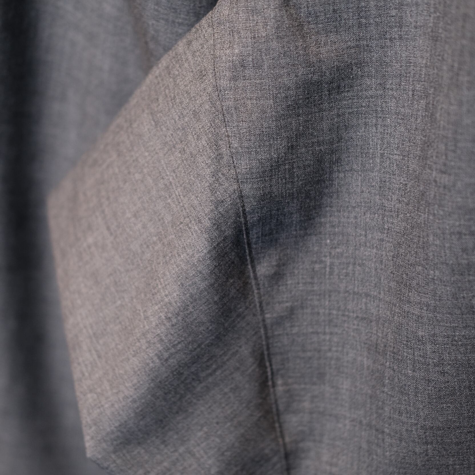 細番手の上質な糸を使用したウール100%の素材で、夏にも穿けるくらい肌触りが良く、シャリ感があります。ウールは吸放湿性に優れているため、汗をしっかり吸収し放出することで、常に快適な状態を保つことができます。また、温度変化にも柔軟に対応し、冷えすぎた室内でも体温の調整を助け、身体の負担を軽減します。こちらの素材は非常に軽量で、加工によりシワになりにくい性質も持っています。