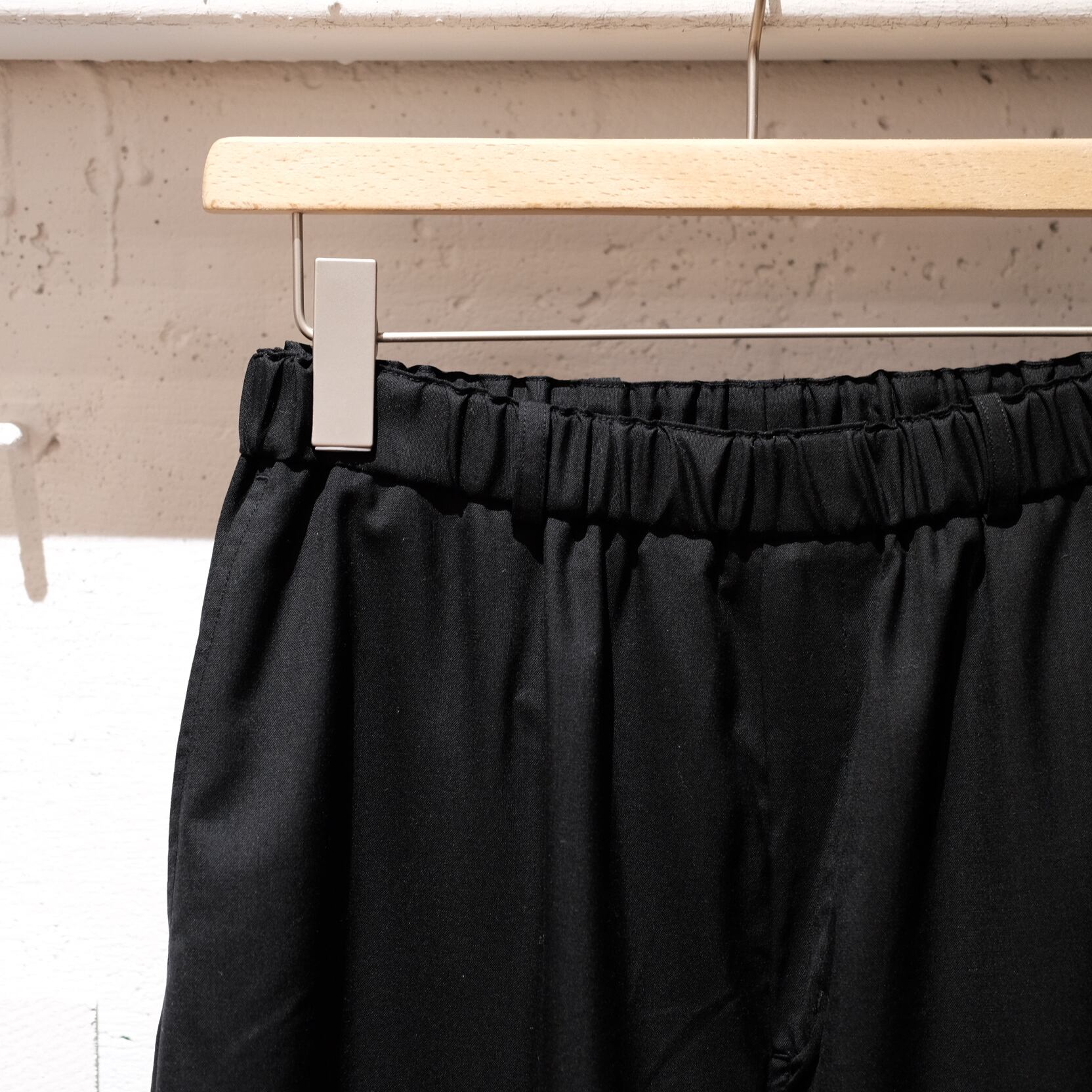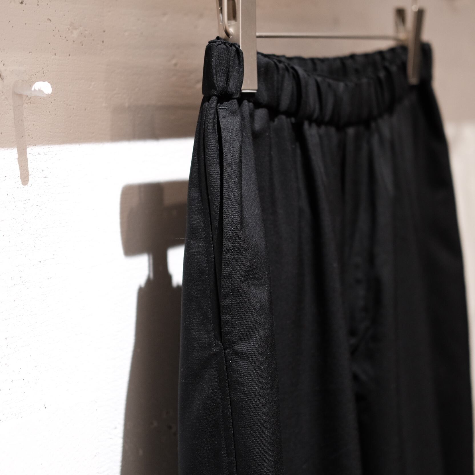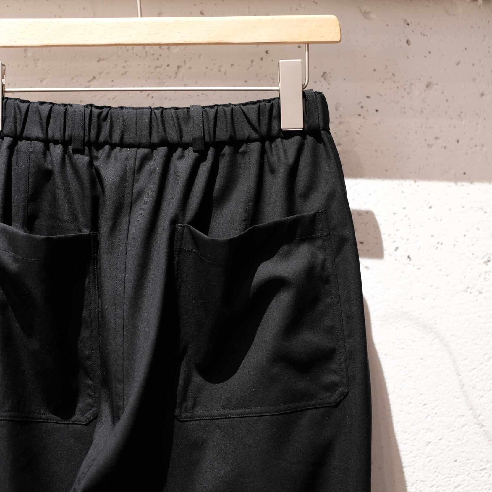 MITTANの定番であるストレートシルエットのパンツで、程よいゆとり感と適度な丈感が特徴です。ウエストはゴム仕様になっており、内側の紐でベルトなしでも快適に着用できますが、ベルトループも配しているため、ポケットをしっかり活用する際などにベルトを使用することも可能です。