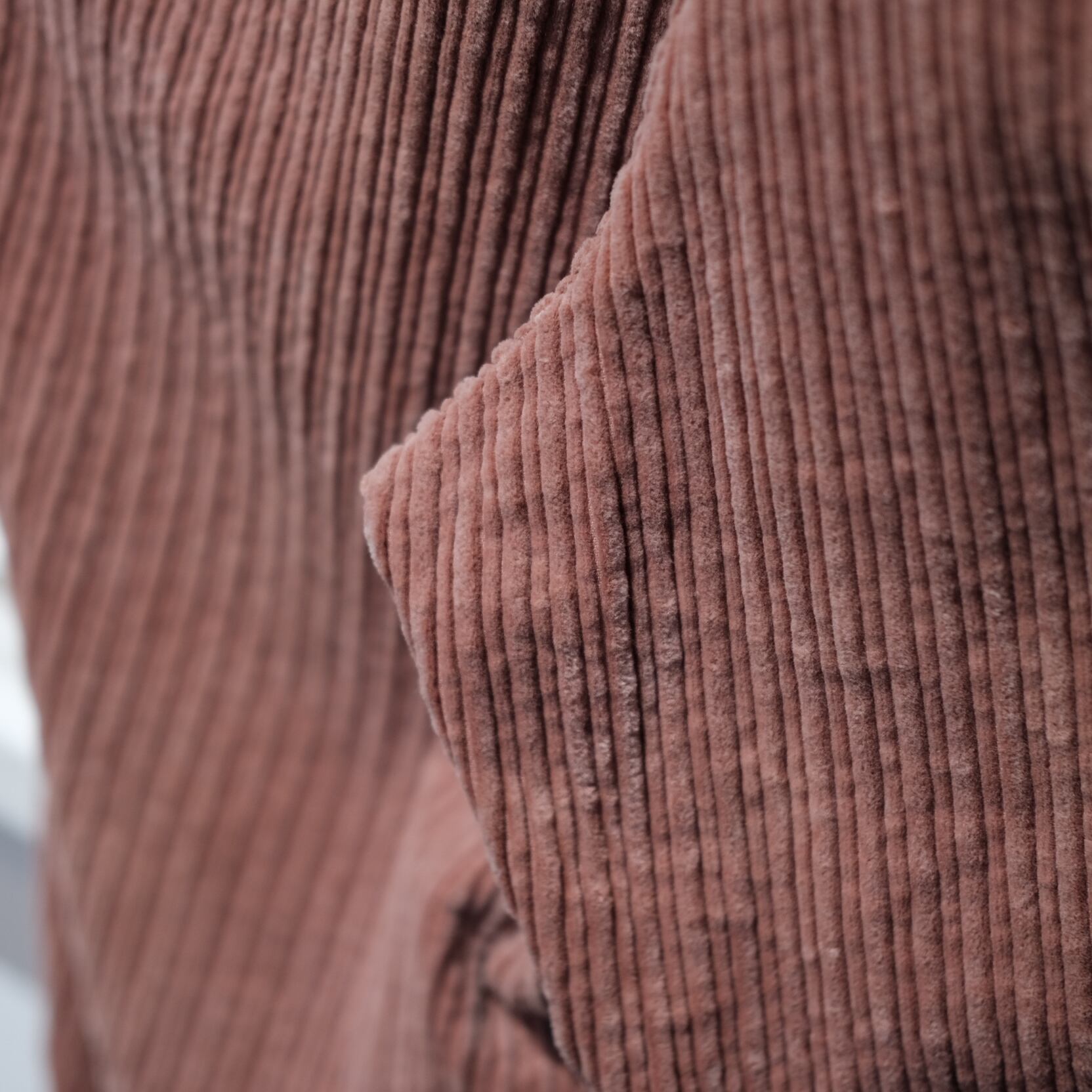大阪の古生地会社より発見したボリューミーな毛足の長いコーズ。エアータンブラーで仕上げされておりふっくらとしたタッチが気持ちいいです。出元は綿産地で有名な浜松エリアと推測されます。特に古いものではありませんが、親子敵などこのような変わったコーデュロイは見つけたら買うようにしています。今回は白を見つけました。奄美大島の草木染、泥染で有名な金井工芸さんに奄美大島の大自然がもたらす車輪梅の煮汁で赤褐色に染めました。